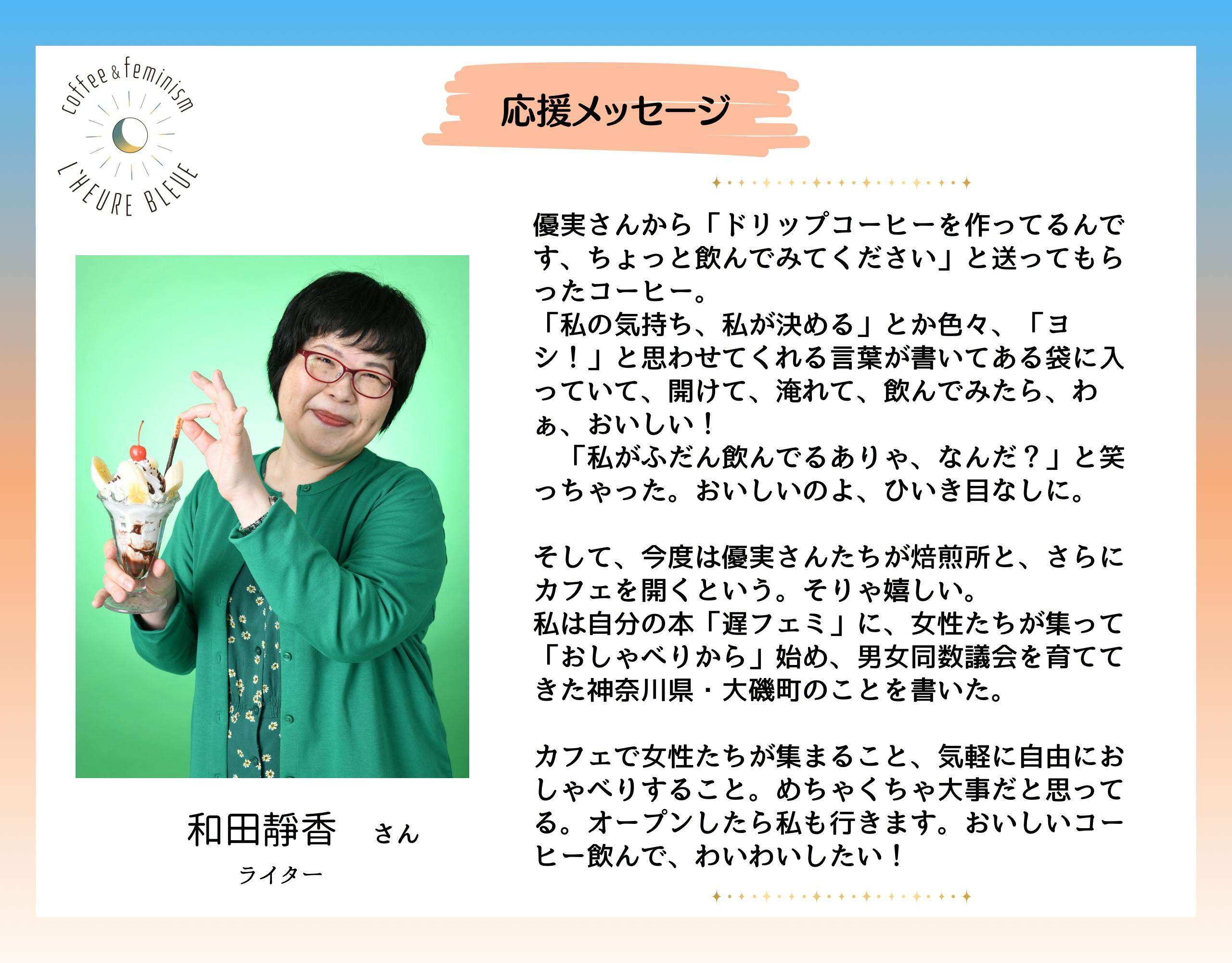 本日は、ライターの和田靜香さんから応援メッセージが届きましたのでご紹介します。