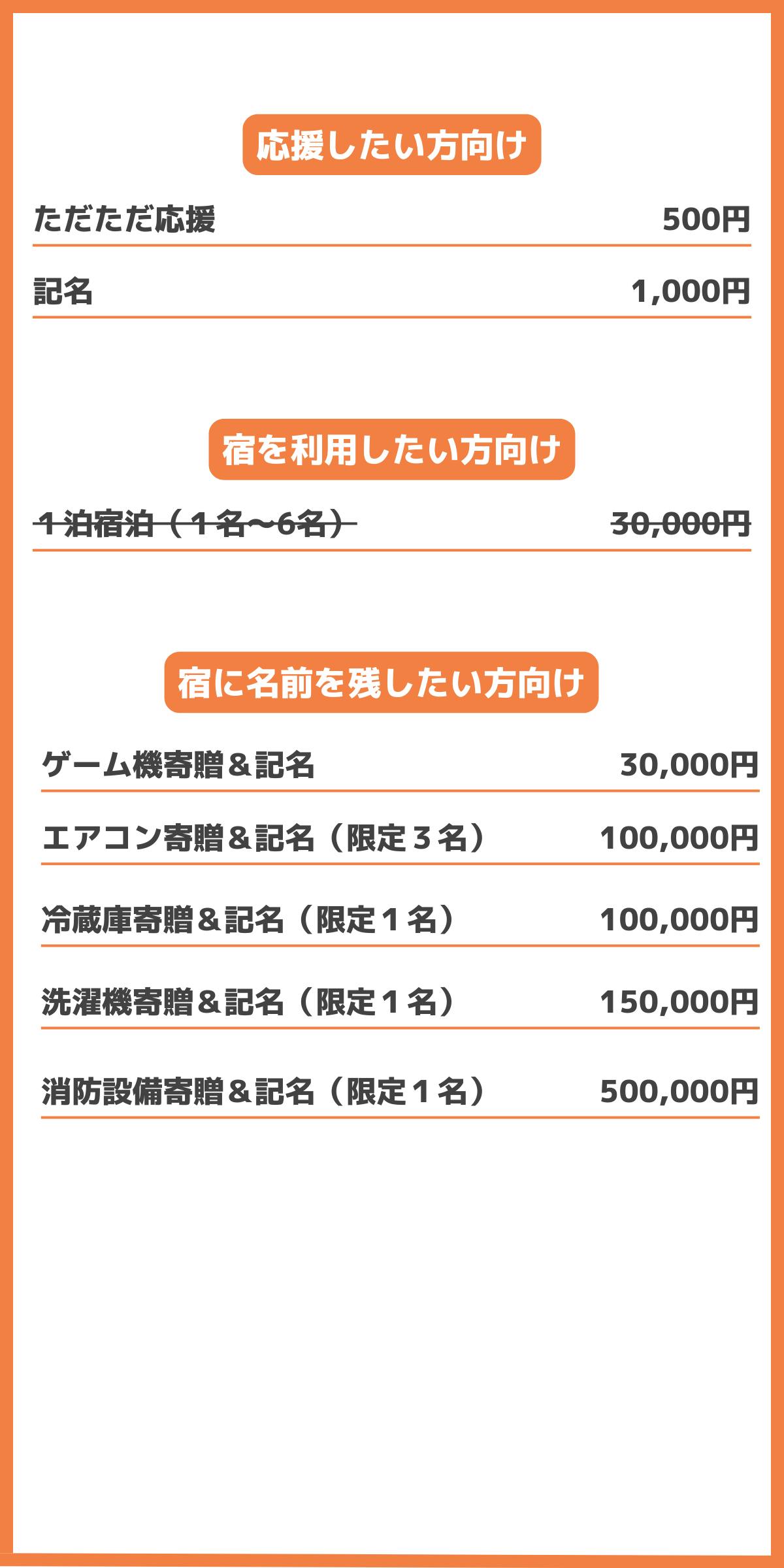 リターンには宿泊券、宿に家電製品を寄贈&記名などをご用意いたしましたので、ぜひご覧ください!