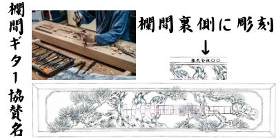 欄間ギターの裏側に協賛名を彫り入れます。欄間ギター完成後、国内外に展示や各メディアに取り上げられる際、御社のアピールやサービス拡散のきっかけになります。