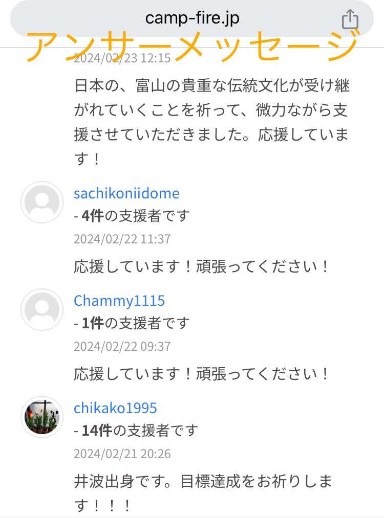 →ちかこさん、井波出身の方からのご支援嬉しいです!ありがとうございます。井波がさらに盛り上がるよう尽力していきます!