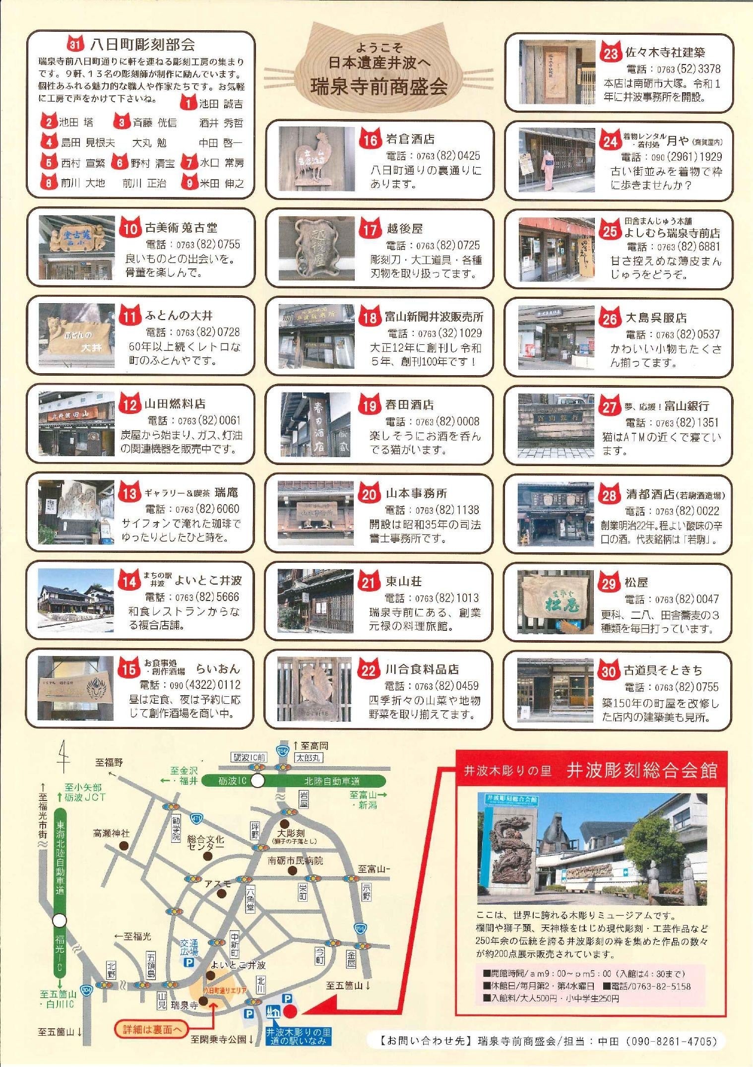 南砺市井波地域の中心部である瑞泉寺前通り(八日町通り)に近年、木彫りの猫が置かれだし、空前の“猫ブーム”に沸いています。今では数十体が町に溶け込み、愛らしい姿や職人の遊び心が好評で、六百年の歴史を誇る門前町の新たな呼び物になっています。井波にお越しの際は是非、下記の「木彫り ねこ探しマップ」をご参考にして探してみて下さい。