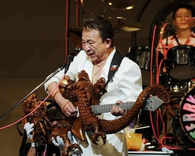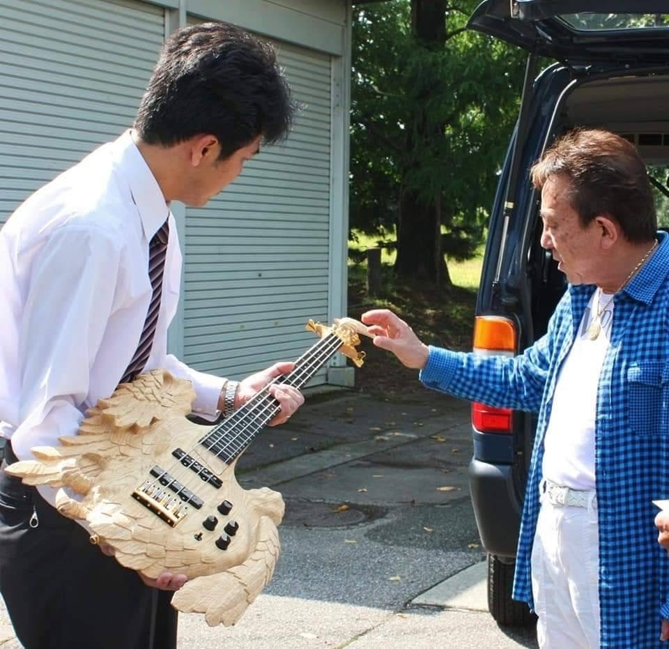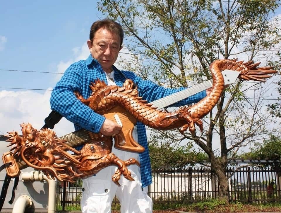 今はもうお亡くなりになられましたが、約15年前、 南砺市井波総合文化センターにて井波彫刻ギター「龍剣」をエレキギターの神様「寺内タケシ」さまに演奏して頂きました。