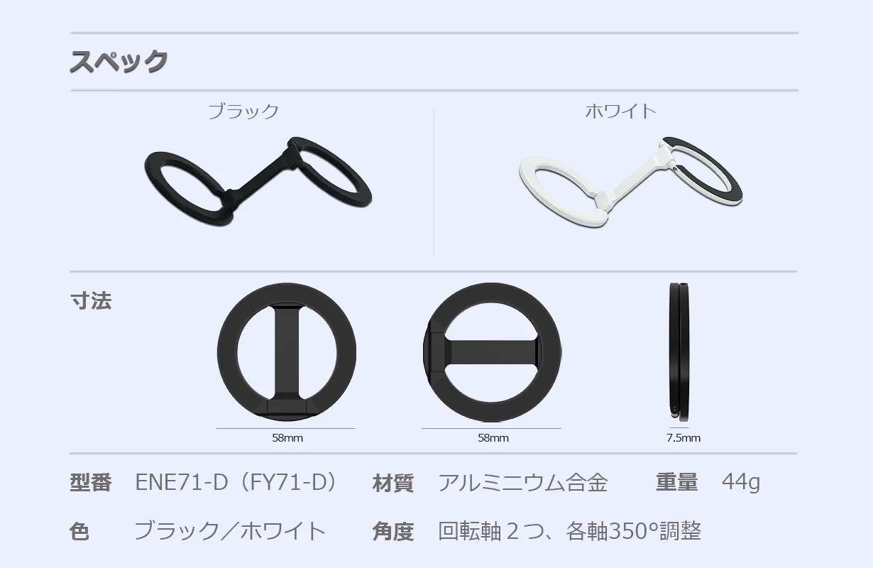 EneHills™のMagicリングは高品質のアルミニウム合金で作られたボディ、多角度調整可能、MagSafe対応でさまざまな場所でご利用可能です。