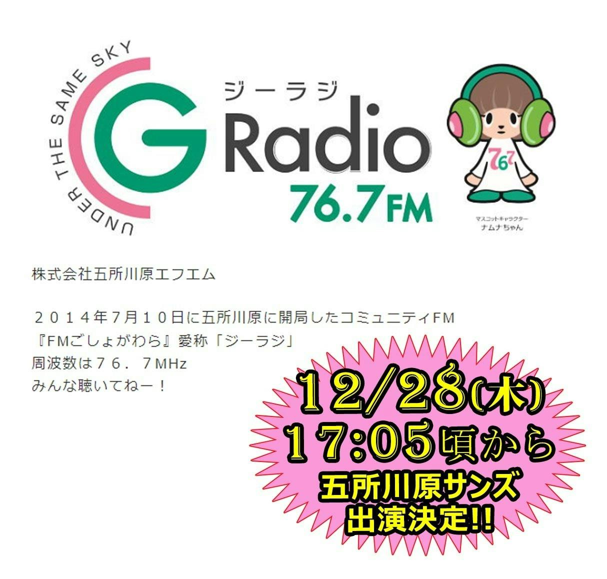 12月28日(木)、地元五所川原市のコミュニティFM「FMごしょがわら(ジーラジ)」さんの夕方の番組「ゆうがたGトーク」に17:05頃から10分間、生出演することが決定しました。