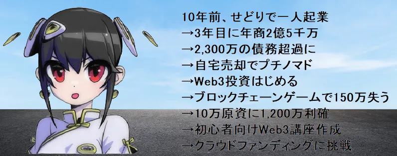 起業してから数多の失敗経験を土台に、ワクワクしながら取り組めて、かつ大きく稼げる可能性のあるWeb3の世界を実践しながら学んでいます。実際に体験したことでしか得られない経験が、私自身の一番の強みです。