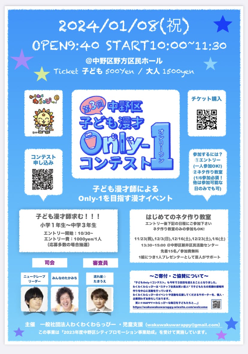 年に一度開催してる『子ども漫才Only-1コンテスト』の第3回大会を実現するために…。