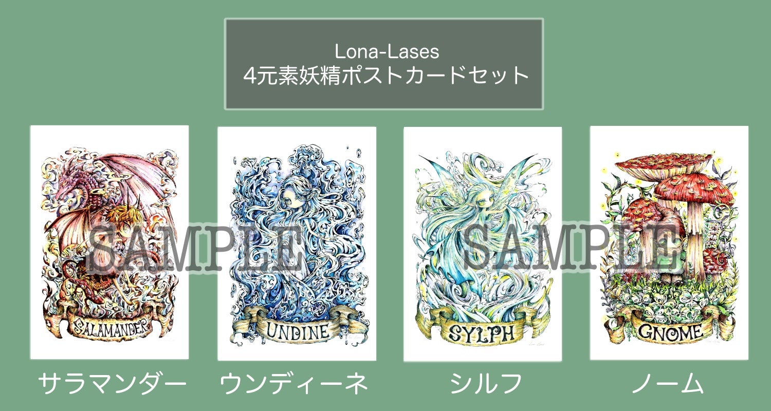 ポストカードは4元素の妖精で、「サラマンダー」「ウンディーネ」「シルフ」「ノーム」の4種類です。