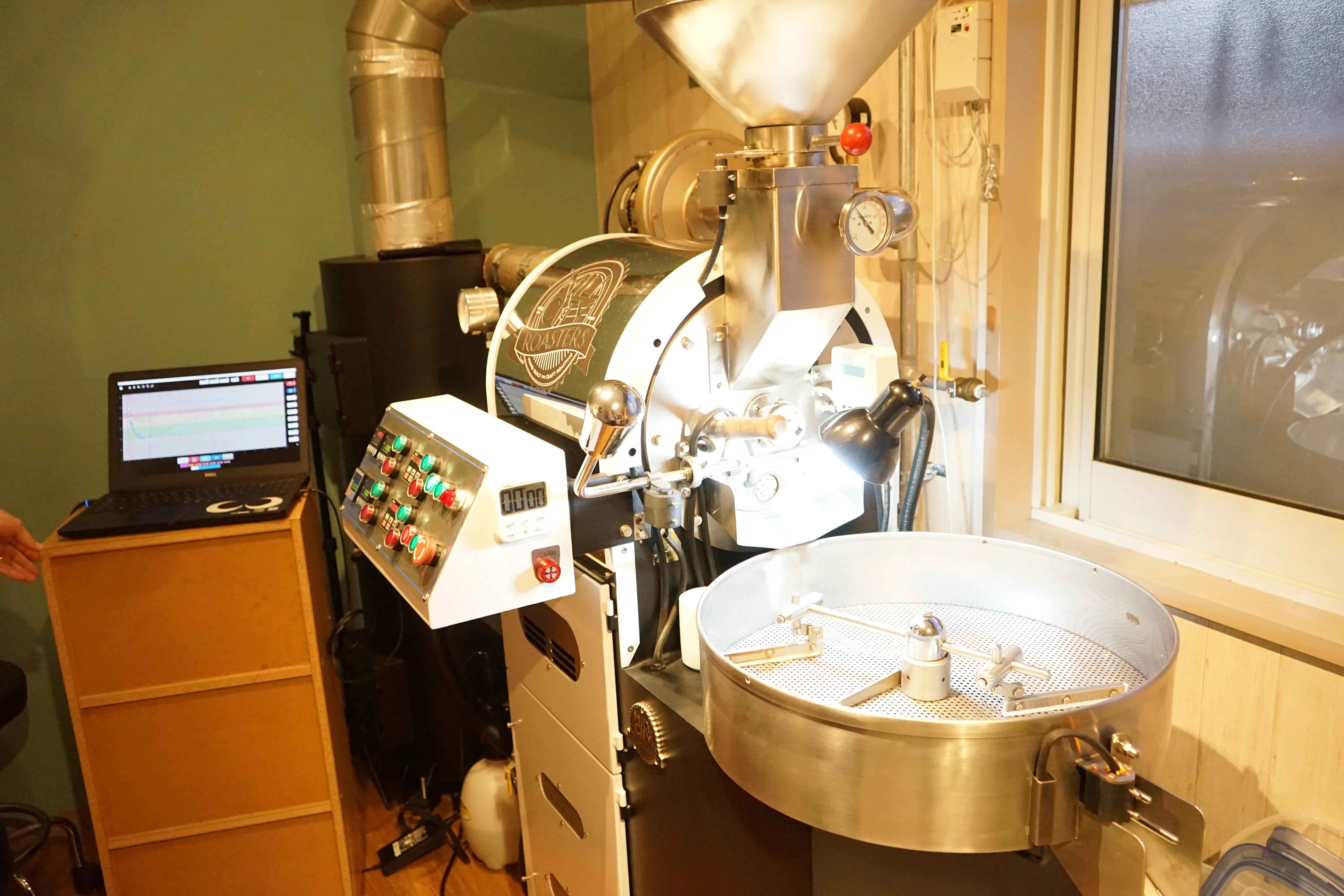 アメリカで設計され、日本とドイツの精密機器を搭載して、中国で組み立てられている焙煎機です。もともとは焙煎教室をされていたスクールが、受講生向けに作った焙煎機だそうです。日本ではまだなじみは薄く、滋賀県ではおそらく使用している店舗はないかと思います。アメリカでは大きなシェアを持つ焙煎機メーカーです。