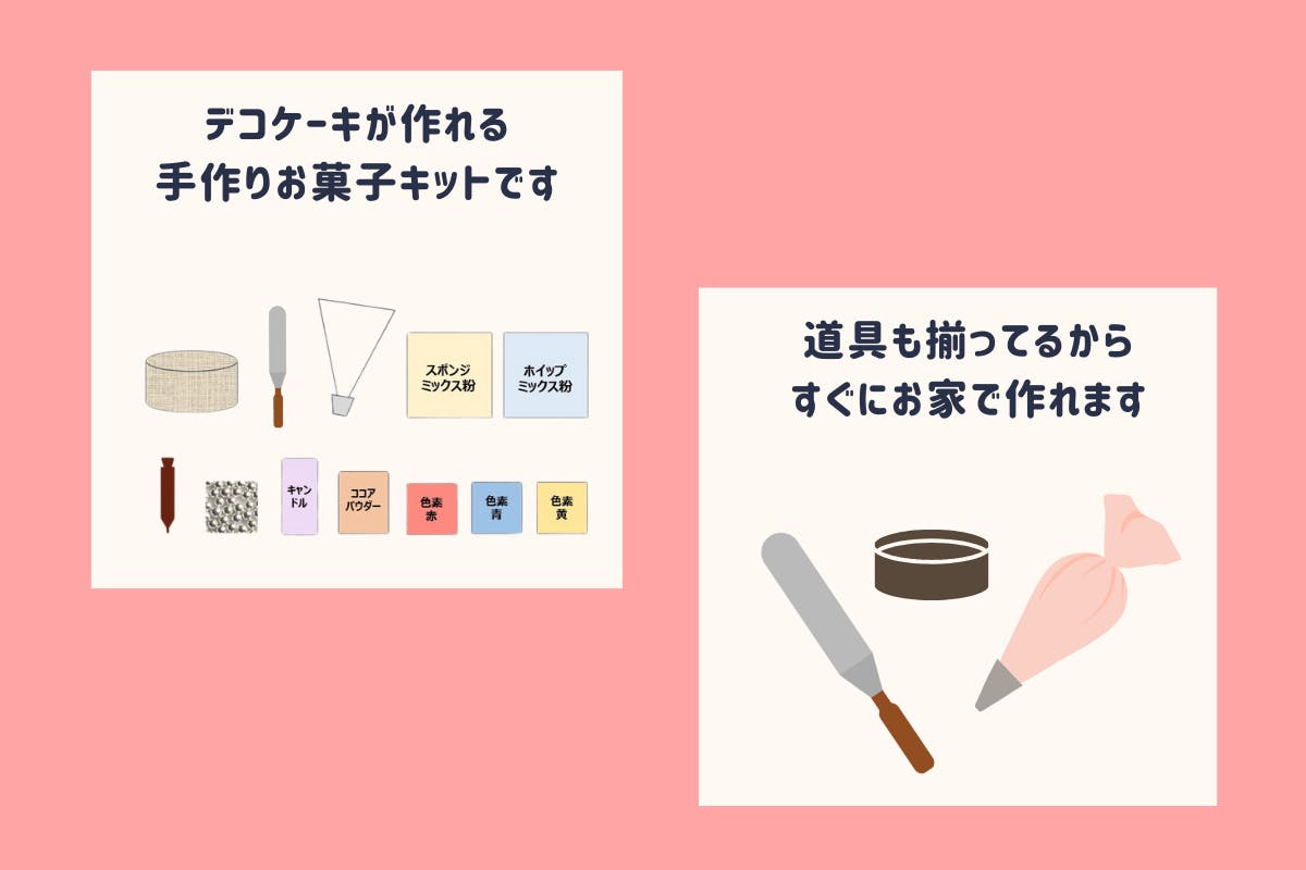 そのために、カスタマイズ可能なオンリーワンデコケーキを気軽に手作りできるキットを提供します。