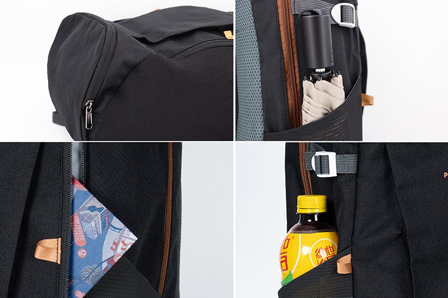 「Calce」の両サイドに傘や水筒を収納するポケットがあり、中央部と底部にノートブックやペン、ティッシュ、モバイルバッテリーなどよく使うものを収納するポケットが設置されます。