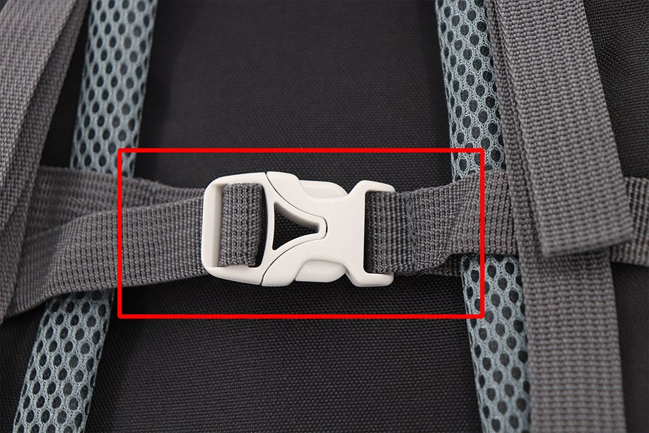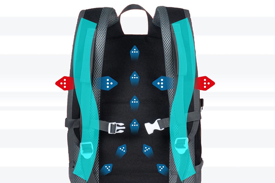 ショルダーハーネス部分にストラップがあり、重い荷物を背負うときに指でストラップを引っ張ることで、圧力を分散させ、肩の負担を軽減できます。