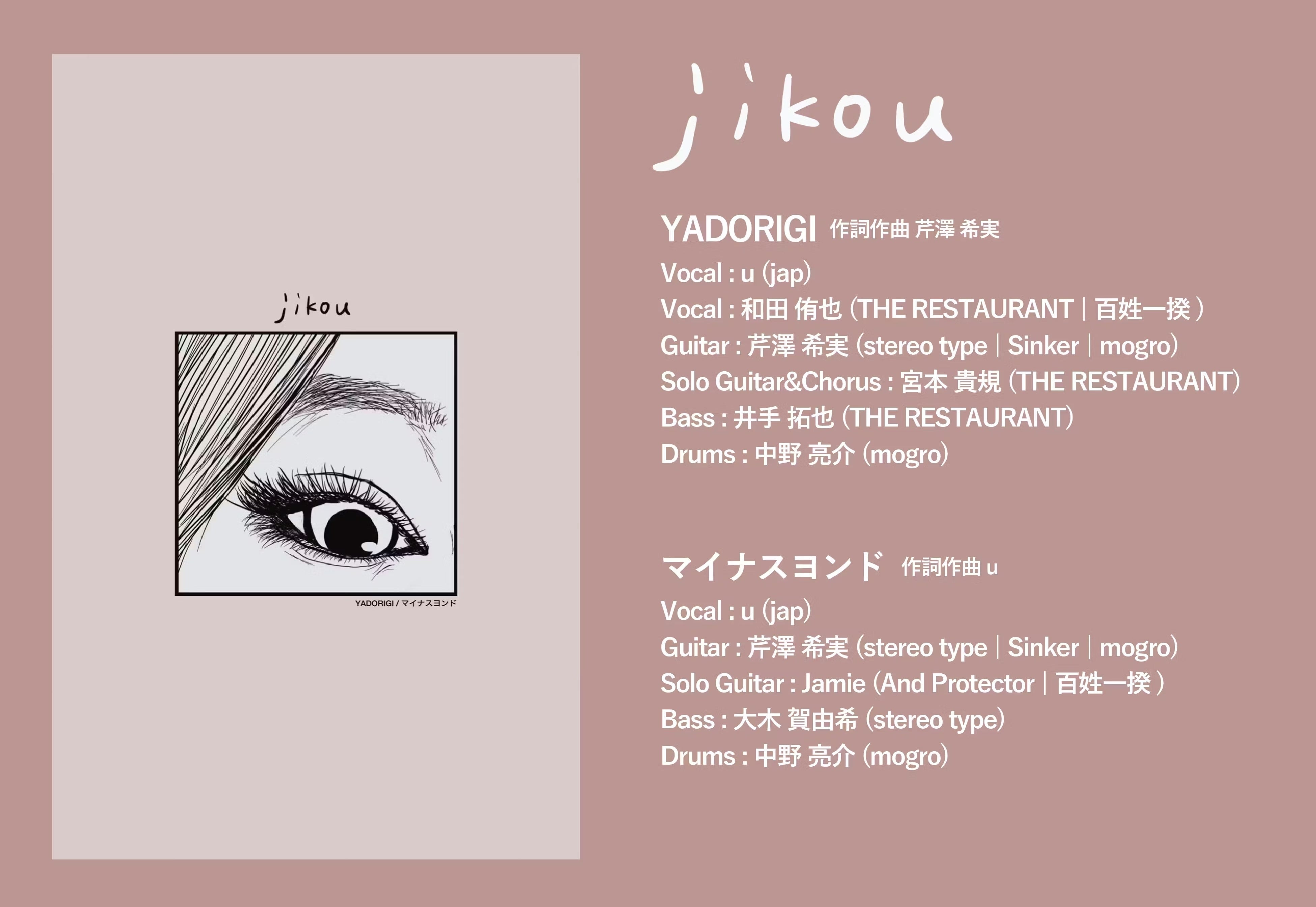 ◆YADORIGI : Vocal : u (jap) , Vocal : 和田 侑也 (THE RESTAURANT/百姓一揆) , Guitar : 芹澤 希実 (stereo type / Sinker / mogro) , Solo Guitar & Chorus : 宮本 貴規 (THE RESTAURANT) , Bass : 井手 拓也 (THE RESTAURANT) , Drums : 中野 亮介 (mogro)
