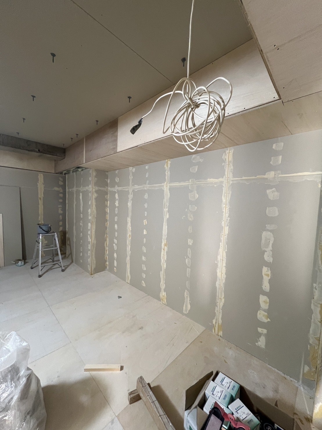 年明け一回目。新年早々インフルエンザに罹ってしまい、2日間はずっと寝込んでいたのですが、だいぶ落ち着いてきたため、工事に参加。(大工さんは昨日から開始してくれている)少しでも天井が高くなる部分を高くしたい無茶な要望に応えてくださってる大工さんによる天井ボード貼りが開始。僕は石膏ボードのパテ塗り作業。(ビスや隙間を埋めるためのもの)