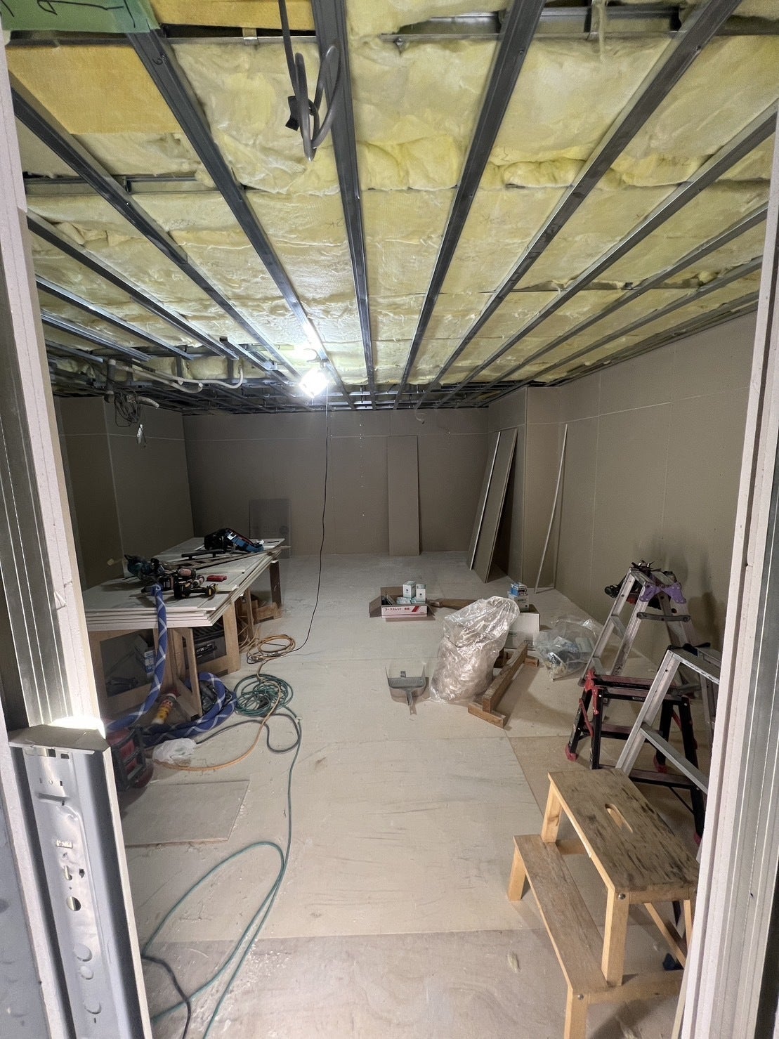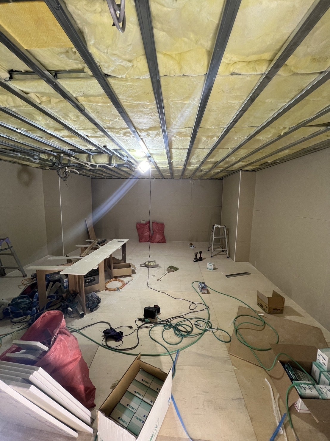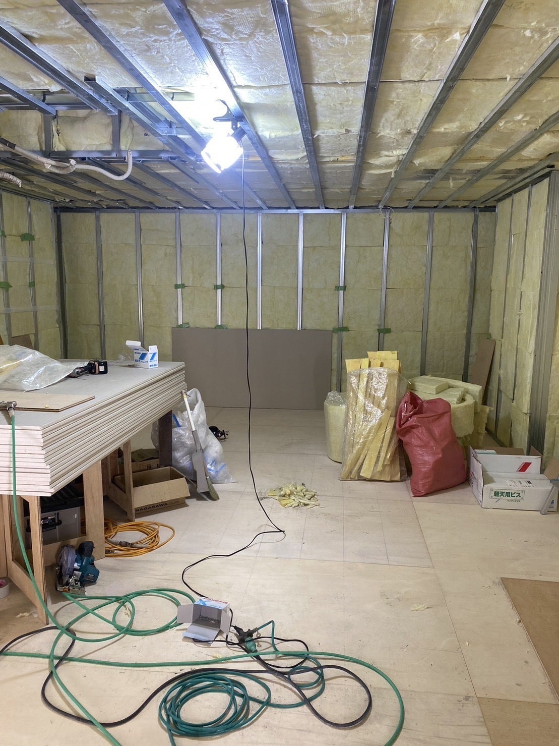 石膏ボードに関しては、防音対策で3枚貼っています。この日で壁一面の3枚貼りが終わりました。この日は午前中はネコ君、午後から侑也君、築が来てくれました。