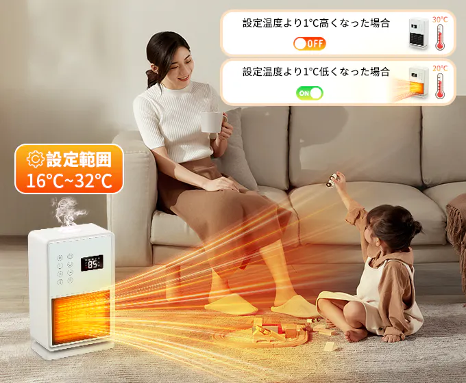 ECO知能恒温モードでは、16℃~32℃という幅広い温度帯で1℃刻みで細かく設定することができます。機器は室温の変化に応じて温風量を自動制御します。このAI知能恒温機能のおかげて通常の暖房器具に比べて電気代を30%以上節約できます。快適性と省エネを両立しています!