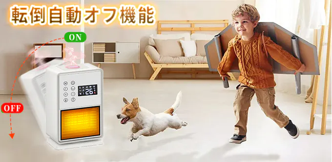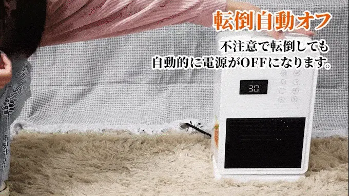 機器本体はV0難燃性を持つ素材を採用し、過熱保護装置も内蔵されています。周囲温度が50℃を超えると、ヒーターは自動的に電源を切り、過熱警告とブザー音が鳴ります。例えば衣類や布団などが覆われていても、自動電源オフ機能で燃える心配がありません。