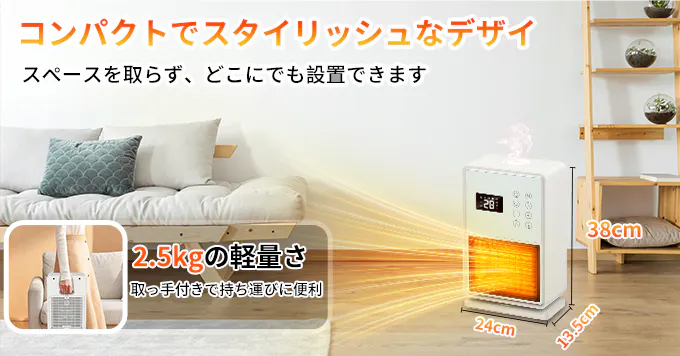 脱衣所や寝室など狭い空間の温度を上げるのに適しています。また、仕事中や自宅で過ごす際の手足の保温にも。