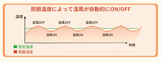 ○ECO知能恒温:室温に応じて送風のON/OFFを自動調節します。暖かさを保ちながら電気代も節約!
