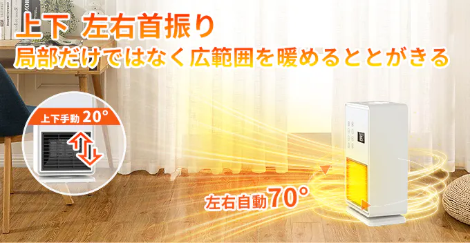 70°左右自動首振り機能により、本体を移動させことなく広範囲を暖めることができます。家族の集まりの際に、全員に暖かい風を送ることができます。
