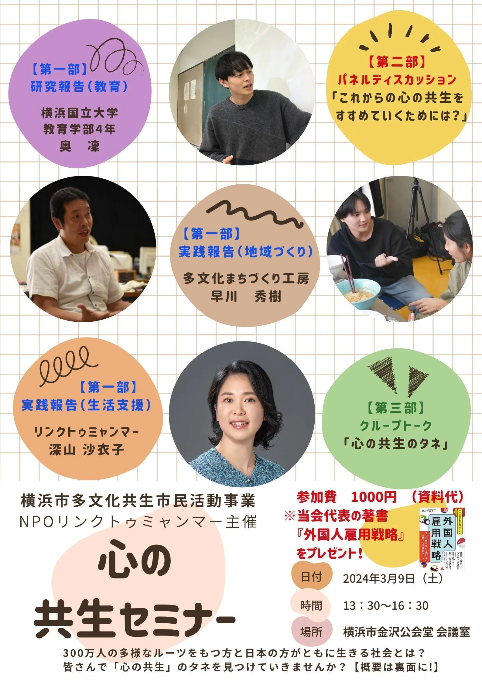本日の中心的な業務は心の共生セミナーの準備でした。私はNPO法人リンクトゥミャンマー理事長・深山紗衣子が発表する「生活支援」のスライドを担当させていただきます。心の共生セミナーでは、理事長の深山が「どのように在日ミャンマー人を支援してきたか」を伝えられたらいいなと思っています。また、心の共生セミナー当日私山田がリンクトゥミャンマーの活動紹介をさせていただきます。