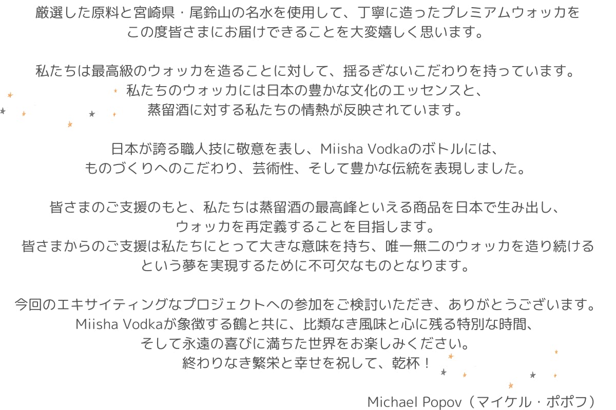 自然豊かな日本でプレミアムウォッカの開発・製造に情熱を注ぐマイケルとドミトリーの挑戦は、まだ始まったばかりです。2人は「Miisha Vodka」を通じて、日本産プレミアムウォッカを新たなカテゴリとして市場で確立していきたいと考えています。
