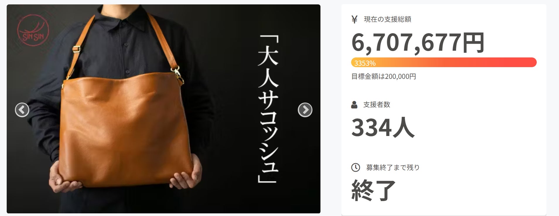 前回の「大人サコッシュ」の実績では334人のサポーターの方から合計6,707,677円が集まりました!!