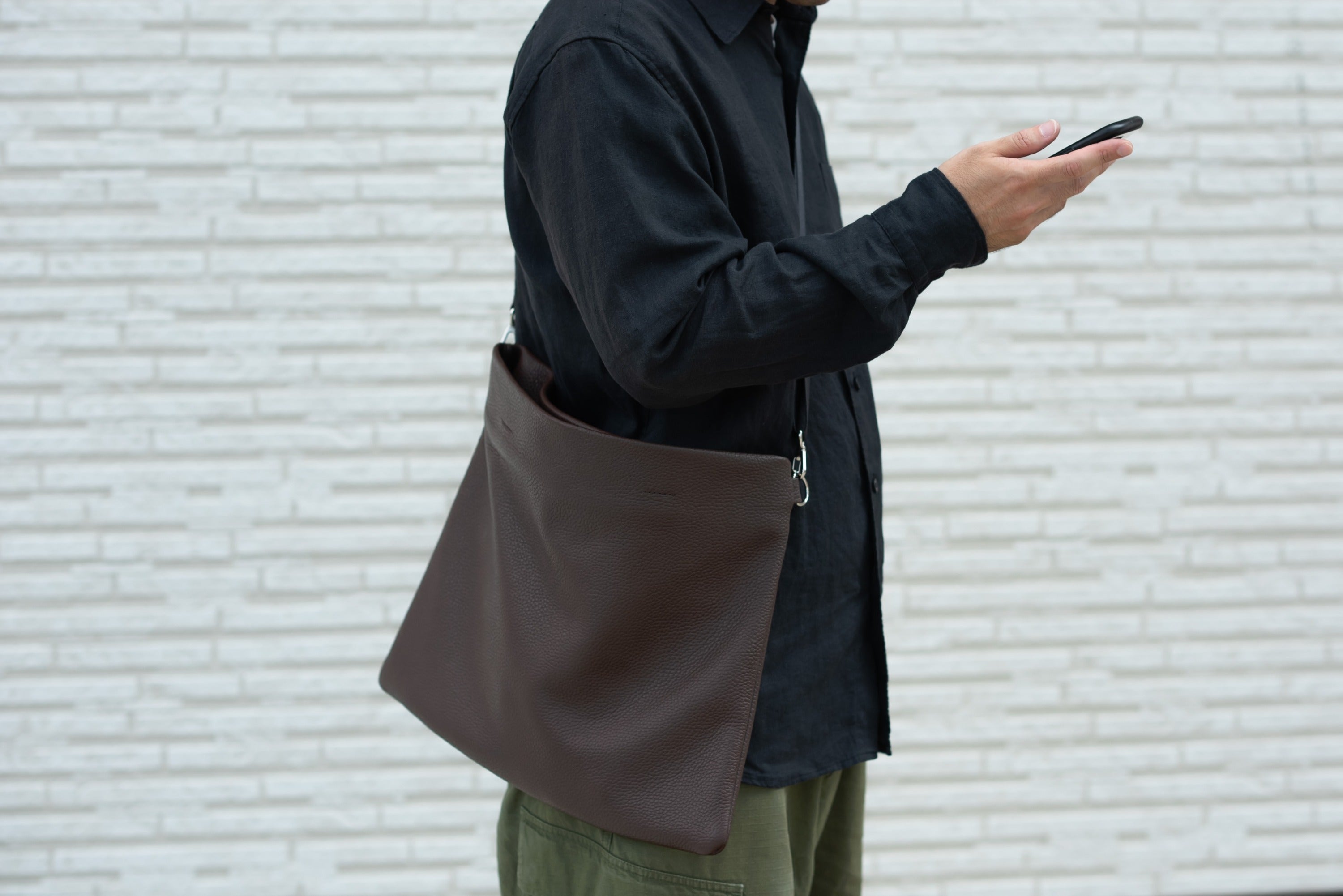 今回もレザー選びに苦心しました。最初使用する予定だった革でサンプルを製作してみたところ、革の値段が高いのに、安っぽい印象のものになってしまいました・・・ですので、姫路のタンナーさん(革を作る工場)まで足を運び、大人サコッシュにドンピシャな革を作ってもらいました!仕上がったレザーは手に馴染む質感が印象的なレザーです。