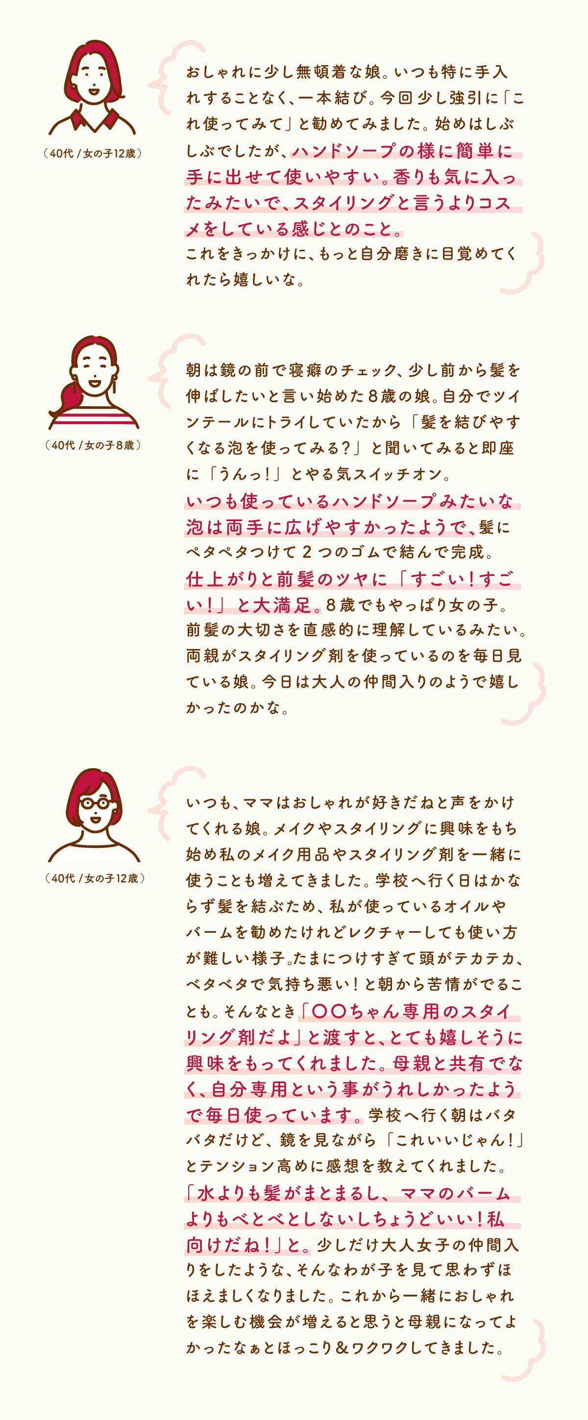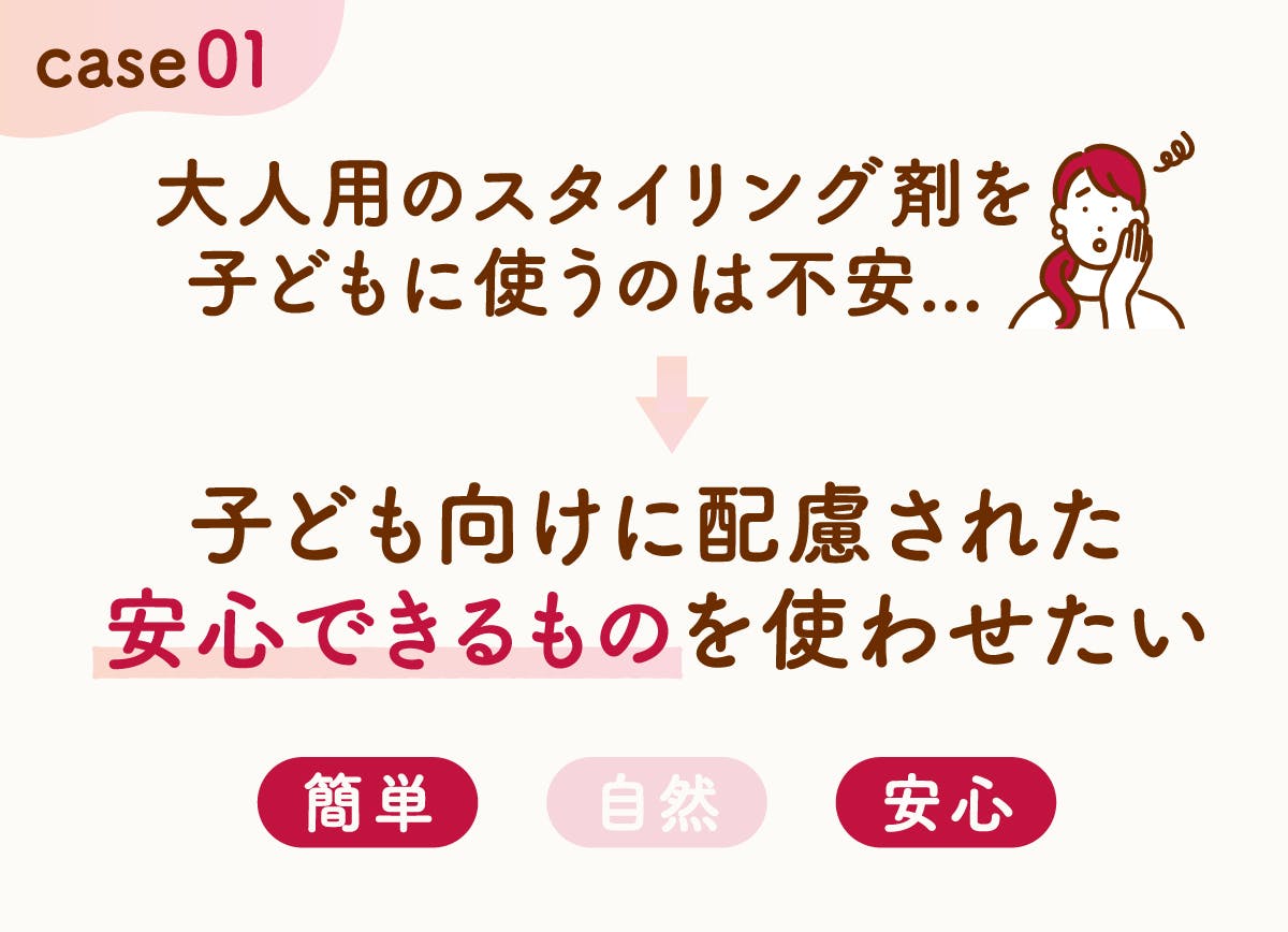 「大人用のスタイリング剤はかたまりすぎるので、子どもに合わせた品質のものがほしい」