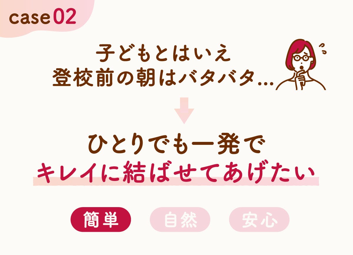 お子さまは学校、部活などの活動で髪をまとめることがルーチンになりますが、親は朝が忙しくてバタバタ、自分でヘアアレンジをできるようになってもらいたい。