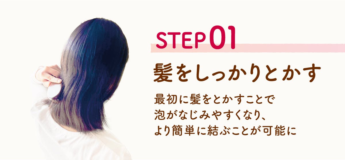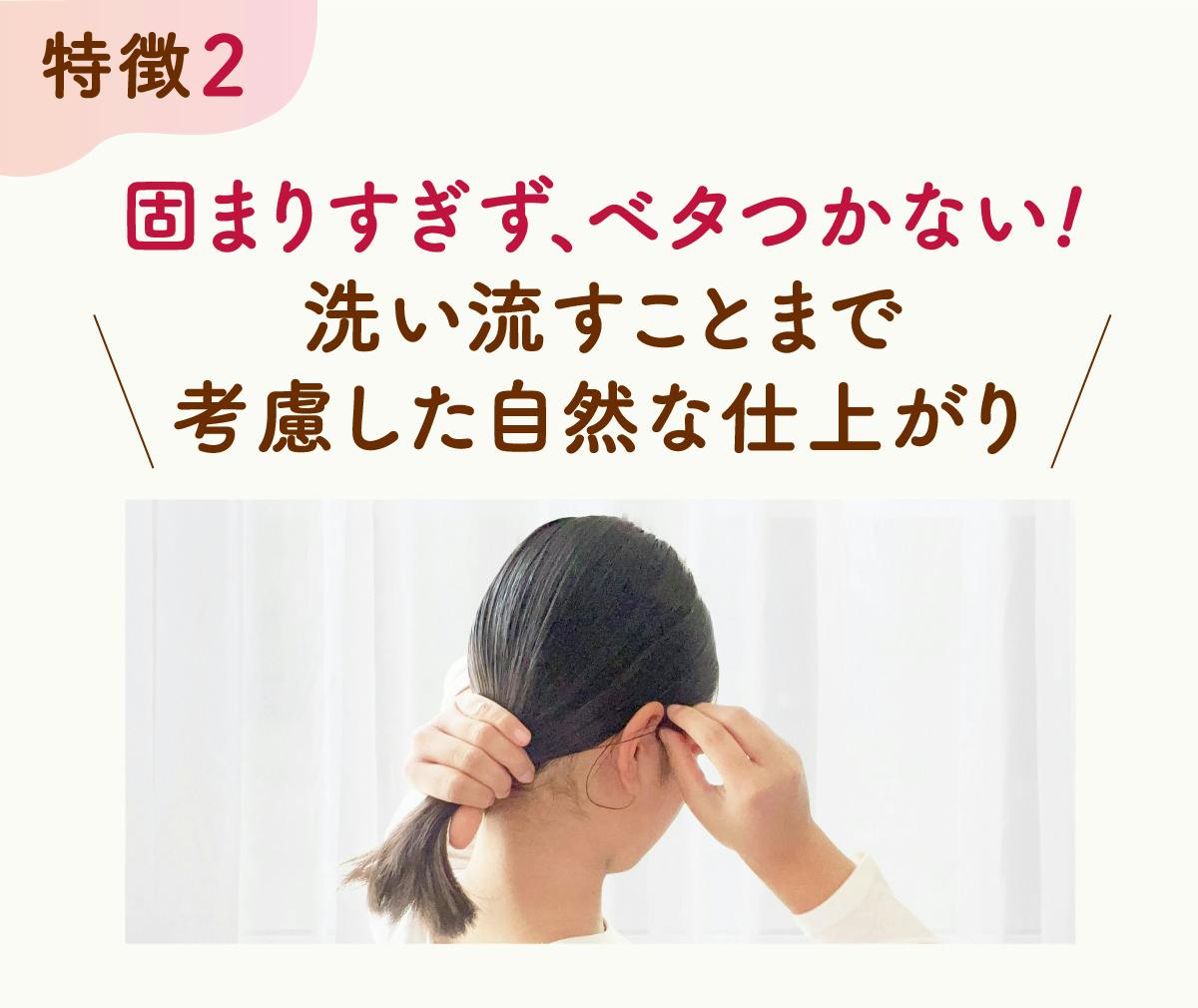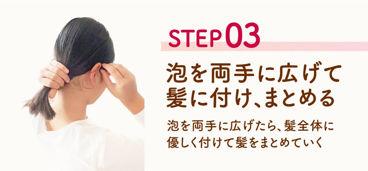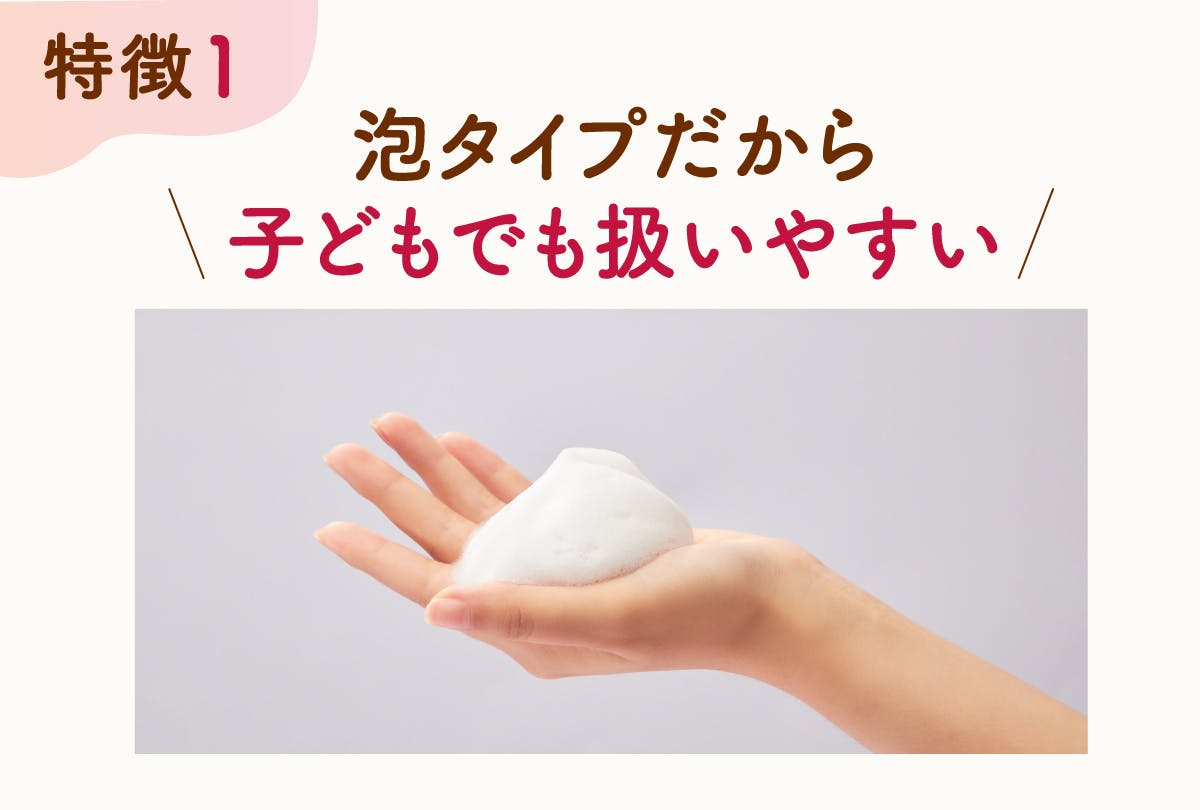そこでこの商品では、「成分」と「扱いやすい剤型」にこだわりました。手に密着する泡タイプなら、髪につける際に飛び散ったり、手からたれて目に入ったりする心配もほとんどありません。