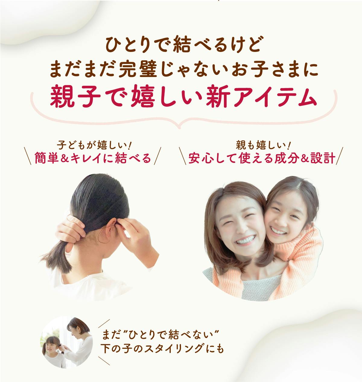 今回開発したのは、"お子さまの髪"に特化した子ども用まとめ髪フォーム。大人の髪質とは違って、細かったり絡まりやすかったり、子どもには子ども特有の髪の悩みが。自分の髪の毛を上手く扱える子もいれば、苦手意識がある子やキレイに結べない子もいます。しかし、小学校高学年にもなると、クラブ活動や習い事などで「一人でキレイに結べて当たり前」の生活が始まります。