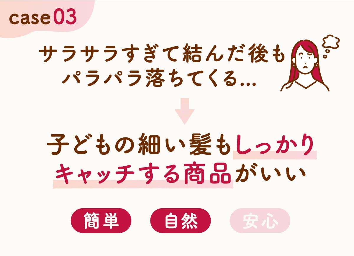 子どもの髪質によっては、細くてサラサラで、キレイにまとめたつもりでも後からパラパラ落ちてきてしまう...ということも。
