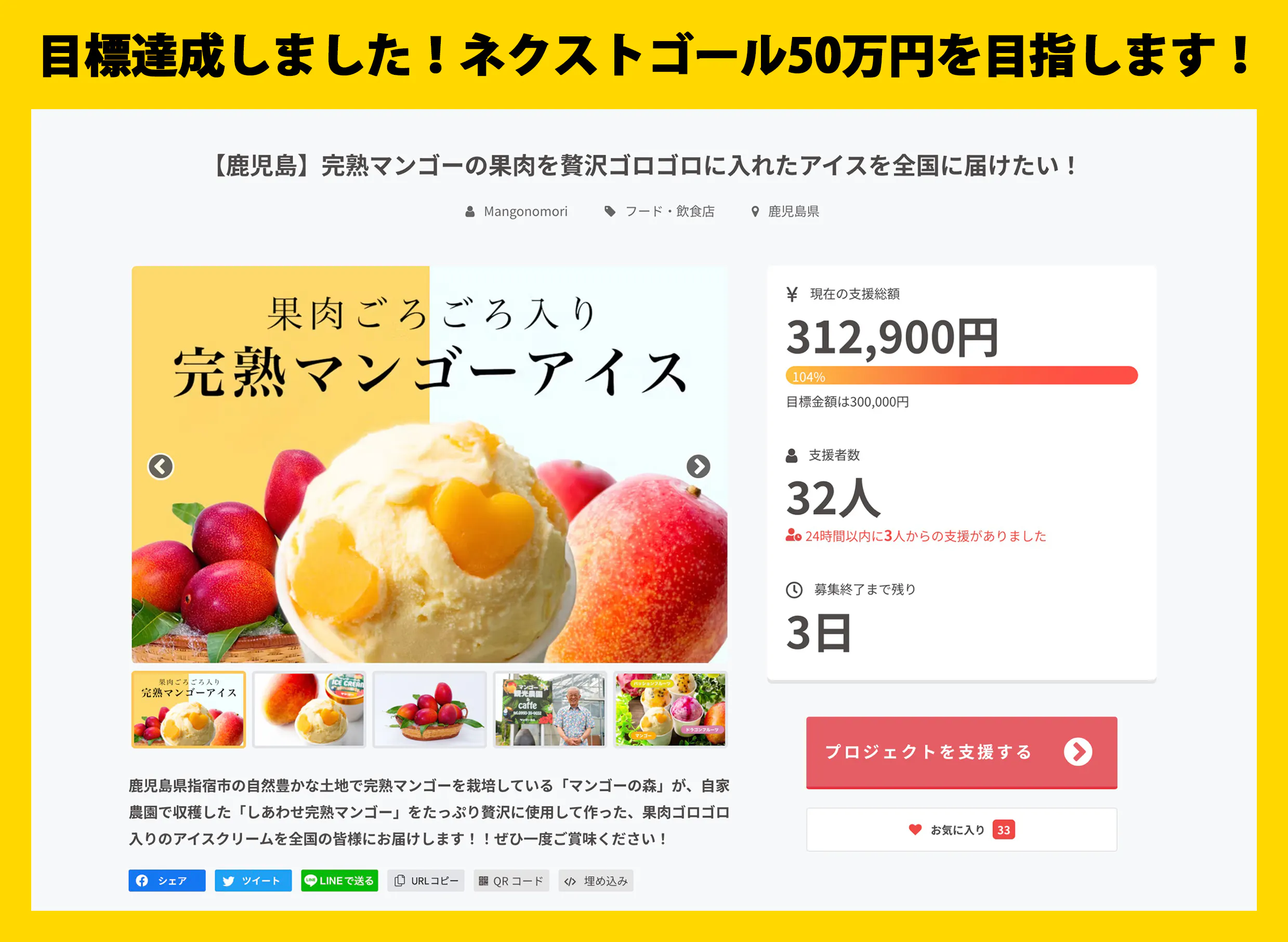 リターン追加のご報告「2024年分収穫予定の完熟マンゴー優先予約権&マンゴーアイスのセット」