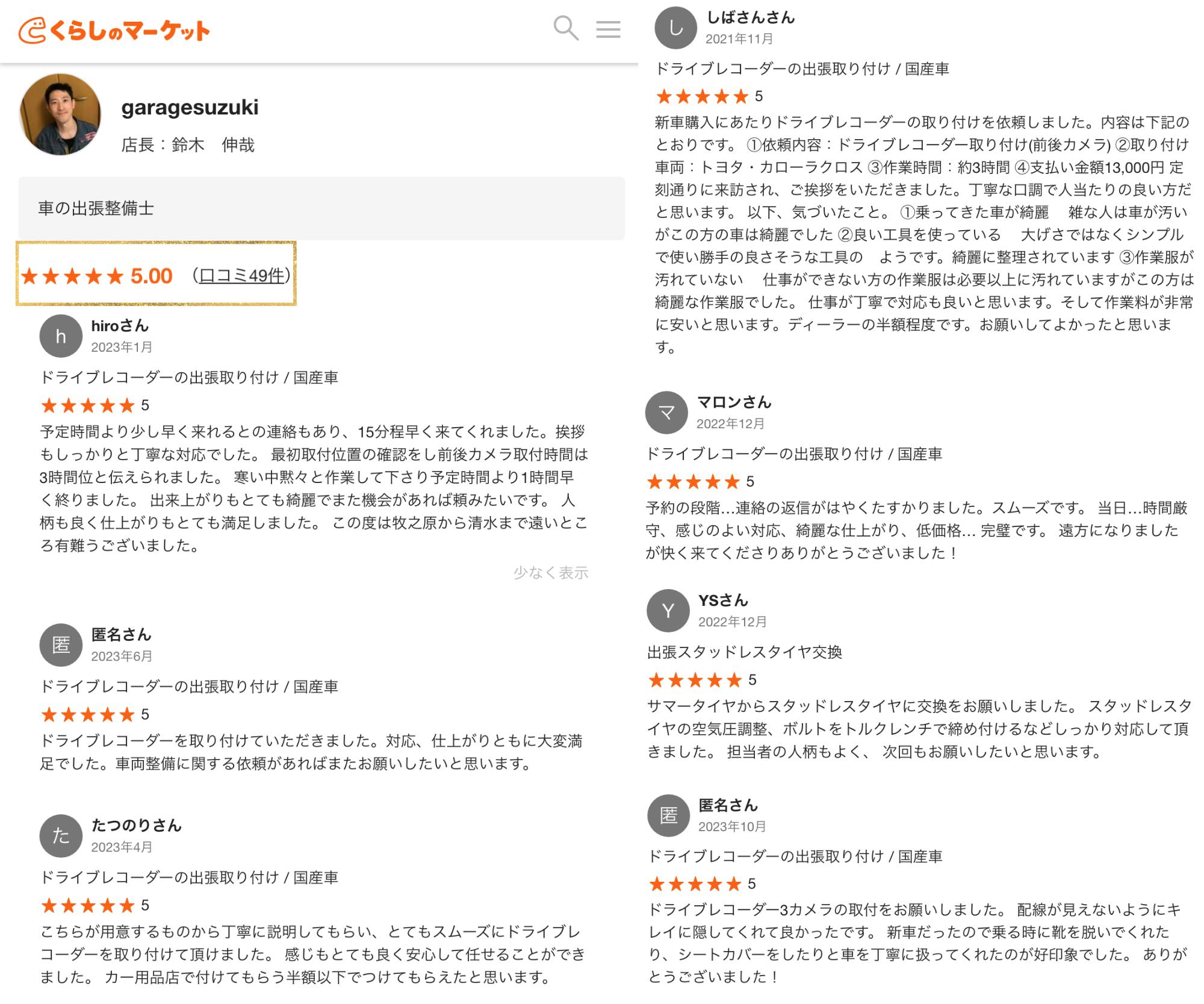 副業として始めた際、なかなか営業活動に使える時間はないため、ジモティーに掲載をし始め、現在はくらしのマーケットをメインにしており、現在くらしのマーケットでの口コミ評価はとてもありがたいことに最大評価の5.00を頂いています。(サービス提供総数は120件、口コミ件数は12月5日現在で51件)
