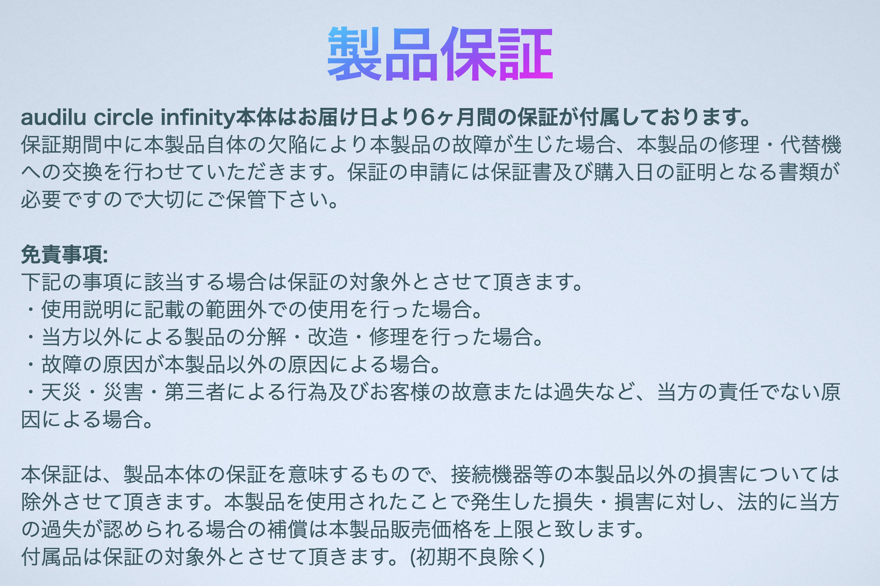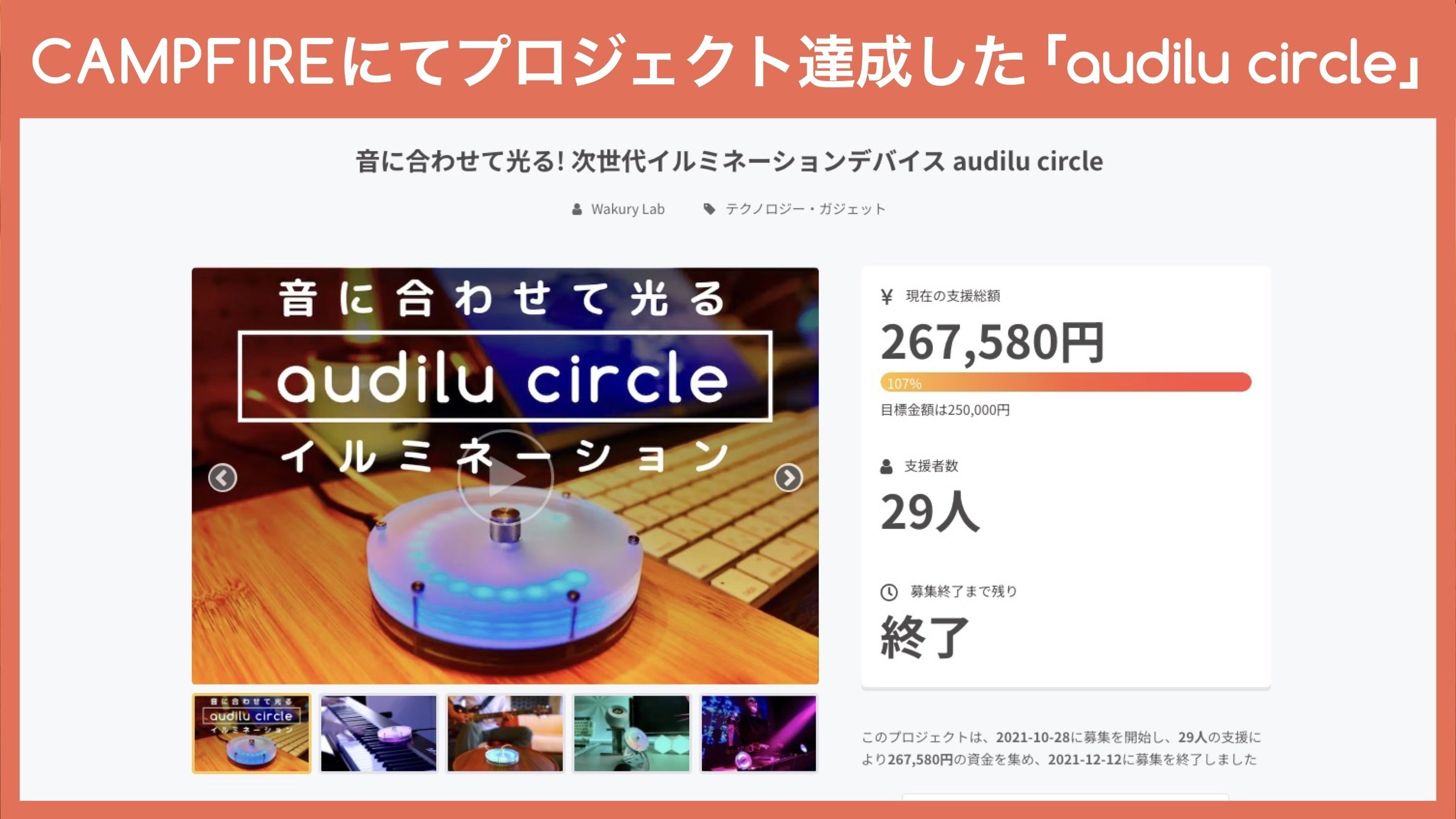 2024/01/03 08:00新年のご挨拶謹んで新年のご挨拶を申し上げます。昨年は大変お世話になりました。本年もよろしくお願いいたします。また、元旦からの地震被害にあわれた方々にお見舞いを申し上げます。被害に遭われた地区の皆様の一日も早い復興をお祈りしています。プロジェクトご支援のお礼ご支援者の皆様、この度はaudilu circle infinityのプロジェクトにご支援頂き大変ありがとうございました。2023年12月31日までの募集を終了し、ご支援頂いた全ての皆様への発送作業を終えプロジェクトを完遂することができました。本プロジェクトは支援金額に関わらずプロジェクトを遂行するAll-in方式での実行でしたが、ご支援者の皆様のおかげで目標金額の98%を達成することができました。今後も皆様に喜んで頂けるような製品の開発に邁進して参りますので何卒よろしくお願いいたします。追伸※万が一、ご支援者様の中にこの度の震災にてaudilu circle infinityが故障された方がいらっしゃいましたら、可能な限り無償での修理対応をさせて頂きますので。落ち着かれました際にご連絡頂ければ幸いです。ワクリーラボ もっと見る