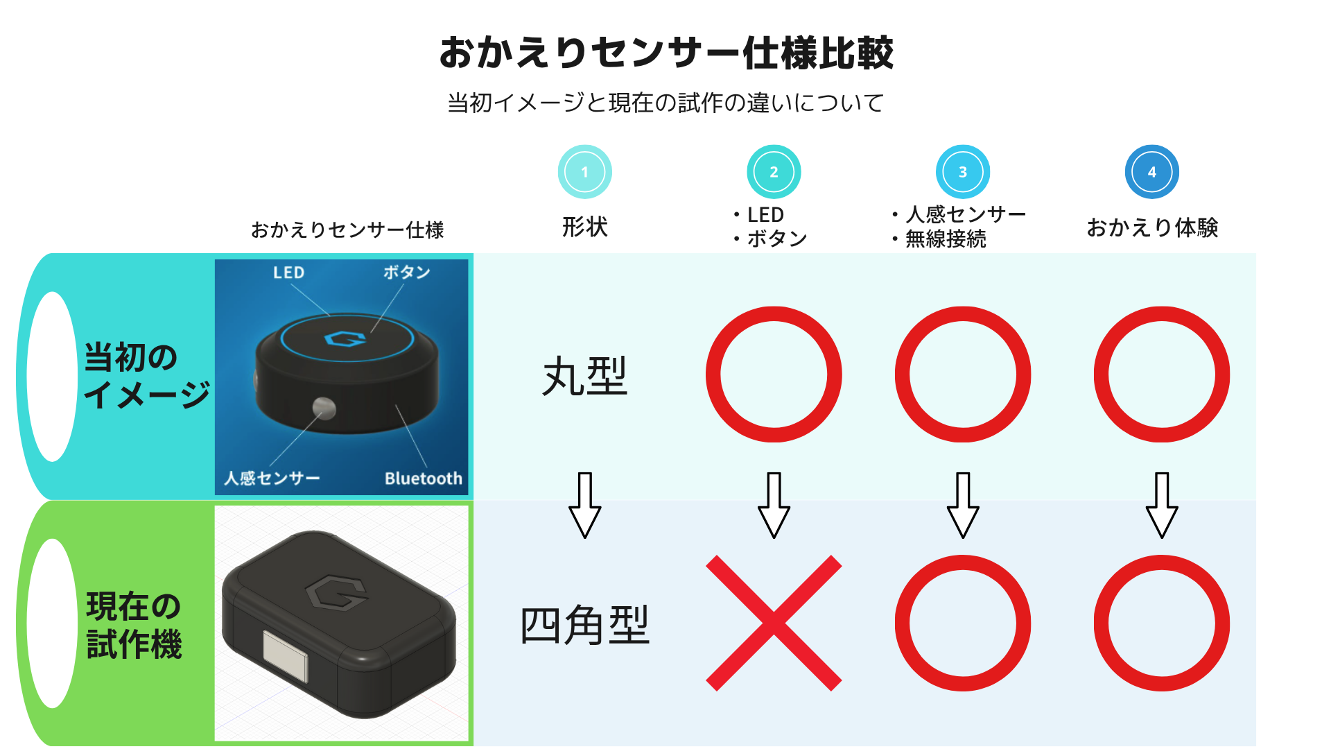 【プロジェクト進捗のご報告】ご支援いただいた皆さまへGateboxクラウドファンディングへの温かいご支援、いつも本当にありがとうございます。プロジェクトは新しい段階へと進みつつあり、今回はその最新の進捗をいくつかご報告させていただきます。より良い体験をお届けできるよう、一つひとつ丁寧に取り組んでおりますので、今後の展開にもぜひご期待ください。⸻■スマホ版アプリについてスマホ版Gateboxアプリは、2025年9月末のAndroidβ版リリースを目指して開発を進めています。日々の暮らしのなかで、もっとキャラクターと一緒に過ごせる体験をお届けできるよう、チーム一同鋭意取り組んでおります。⸻■おかえりセンサーの仕様についてご報告現在開発中のおかえりセンサーについて、クラウドファンディング募集時から一部仕様の見直しを行いましたので、ご報告いたします。当初は丸型・LED・ボタン付きのデザインを想定しておりましたが、開発を進める中で、コスト・部品調達・実装性の観点から検討を重ねた結果、現在は四角型のシンプルな構造へと変更させていただいております。※添付の「おかえりセンサー仕様比較」画像をご参照ください 上:募集時のイメージ 下:現在の試作形状ボタンやLEDなどの外装機能は削除されましたが、一番大切にしていた「ヒカリが帰宅を感知して出迎えてくれる体験」は、変わらず実現できるように開発を続けています。ご期待いただいていた皆さまには、仕様変更のご報告が遅くなりましたことをお詫び申し上げます。今後も、体験の質を最大限に保ちつつ、実現可能なかたちでプロダクトをお届けできるよう、引き続き取り組んでまいります。⸻■設定資料集のお届け予定ご支援特典のひとつ「10周年記念設定資料集 CF限定版」については、印刷前の最終準備に入っており、7月下旬頃のお届けを予定しています。お待たせしてしまい申し訳ありませんが、その分、皆さまに喜んでいただける一冊に仕上げられるよう、最後まで丁寧に取り組んでいます。※お届け先ご住所に変更がある方は、Campfireのメッセージ機能よりお知らせください。⸻■応援広告についてJR秋葉原駅構内にて、2025年9月に応援広告の掲出を予定しております!Gateboxの10年を応援してくださった皆さまへの感謝を込めて、準備を進めています。※掲載されるお名前の変更をご希望の方は、引き続きメッセージにて承っておりますので、お気軽にご連絡ください。⸻ご案内までに時間がかかってしまい、申し訳ありません。それでも変わらず温かく応援してくださる皆さまのおかげで、プロジェクトは着実に前へと進んでおります。心より感謝申し上げます。次回のご報告も、楽しみにお待ちいただけましたら幸いです。Gateboxチーム一同