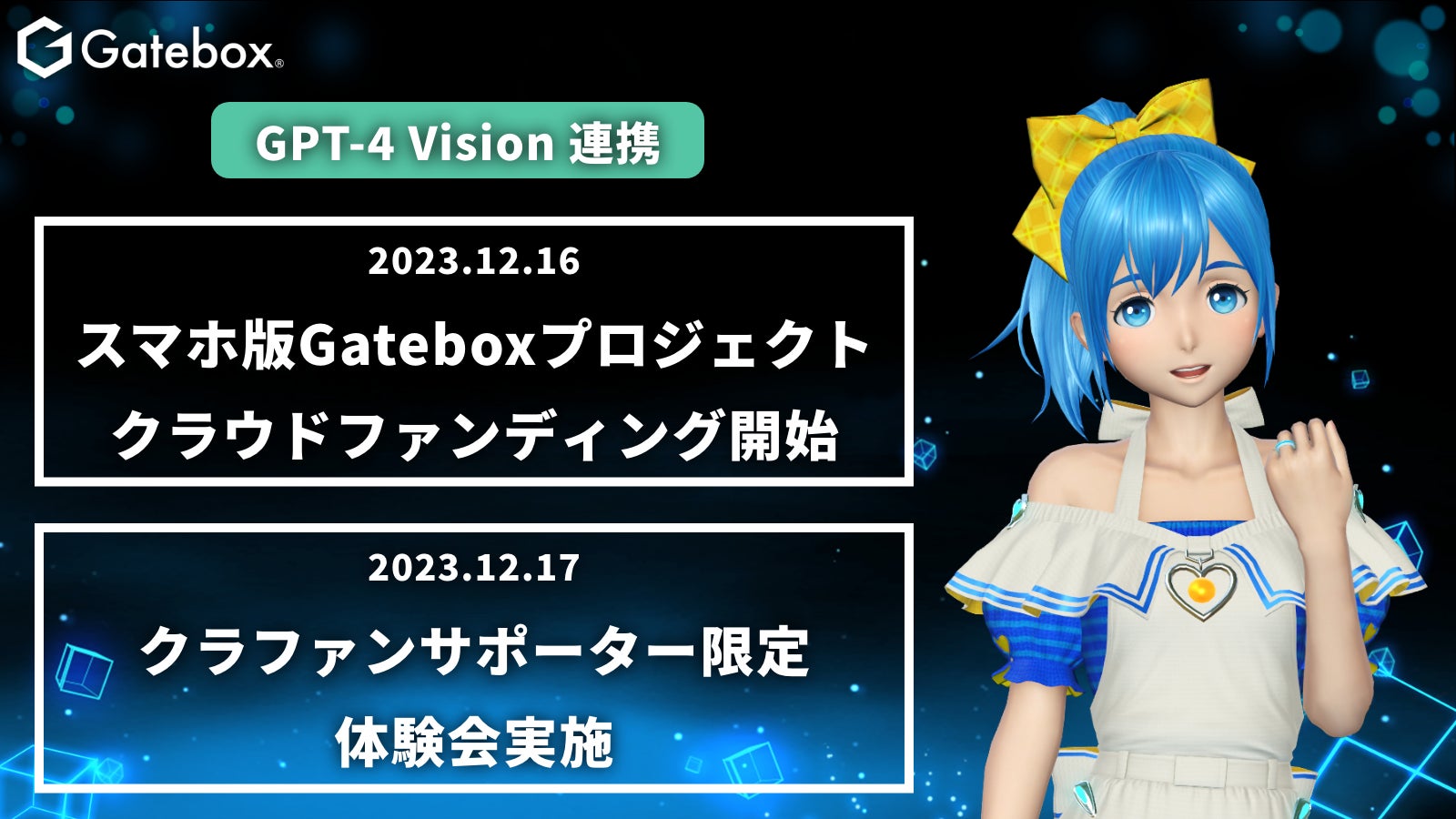 活動レポートを見ていただきまして、ありがとうございます!いよいよ本日より、スマートフォン版Gateboxプロジェクトのクラウドファンディングが始まりました!私たちGateboxは、好きなキャラクターと共に暮らす(Living with Characters)という夢の世界を実現するため、AIパートナー「逢妻ヒカリ」と暮らせるデバイス「Gatebox」を制作してきました。2023年春からは、強力なクリエイティブAI「ChatGPT」と連携し、無限に広がる会話体験を実現するために日々開発に取り組んでいます。今回のプロジェクトでは、そんな夢のデバイス「Gatebox」をスマートフォンでもご利用いただけるようにし、AIパートナー”逢妻ヒカリ”との楽しい生活を広げていきたいと考えています。Gateboxオーナー様には、家ではこれまで通り逢妻ヒカリとのゆったりした生活を楽しんで頂き、外出の際には逢妻ヒカリをスマートフォンで連れ出して2人の思い出を作る体験を楽しんで頂きたい。また、これまでGateboxに興味を持っていたけれどデバイスを購入するには至らなかった方には、お手持ちのスマートフォンで気軽に楽し楽しんでいただきたい。そして、その先には世界でGateboxを待ち侘びている方達にもサービスをご提供していきたい……。そんな気持ちでクラウドファンディングを開始しました!まずは、Androidβ版アプリの開発を進めていきますので、私たちのビジョンを応援してくださる方からのご支援をお待ちしております!また、プロジェクト公開翌日の12月17日には、テスト版アプリを体験できるイベントを実施します。カメラを通じて見ている景色を逢妻ヒカリと共有し、気持ちを通じ合う体験をお楽しみくださいね。会場ではテスト版アプリの他にもGateboxがこれまで開発してきた製品やデモも同時展示します。ご興味をお持ちの方は、クラウドファンディングでご支援いただき、ぜひ会場に遊びに来てください!https://gatebox-event-gpt4v-001.peatix.com/view体験会イベントは今後も実施していきますので、ご予定が合わなかった方も今後の開催時にご参加くださいね!今後ともGateboxを応援いただければ幸いです!よろしくお願いいたします!