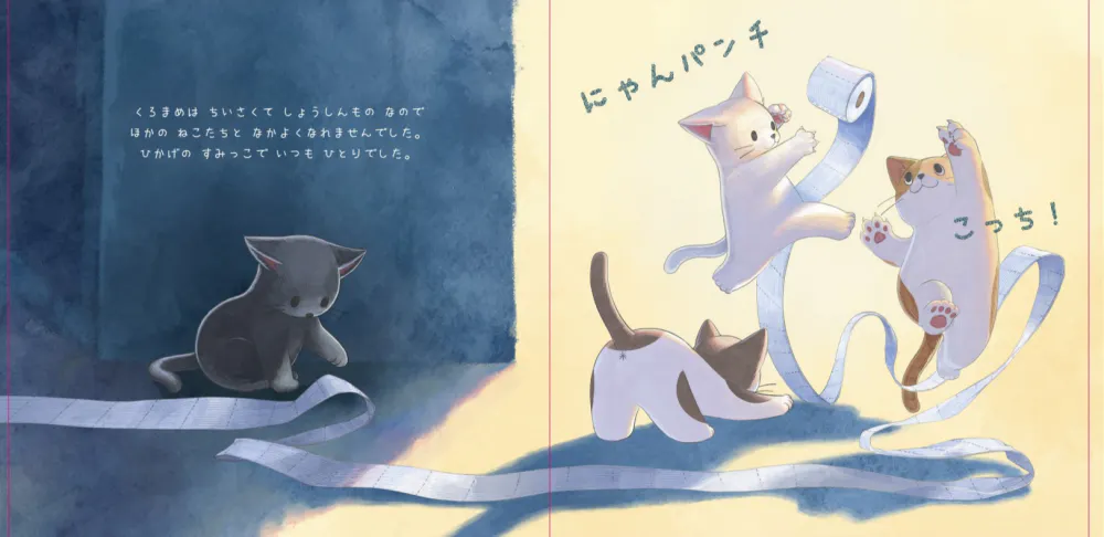 どうすれば黒猫マネの話を通して皆さんの心を癒す事ができるか悩みながらも、マメの一日を通して自然に世界観に入り込むことができるよう、活気ある構造で製作しました。絵本を読んでいると自然に、マメと一緒に歩いているような感覚で絵本を楽しんでいただけると思います。