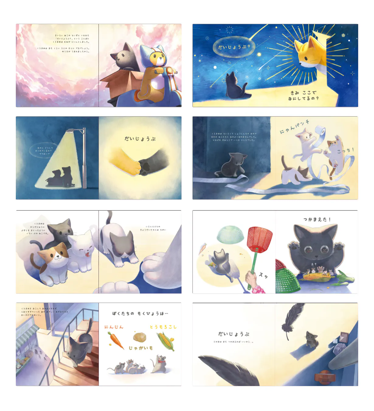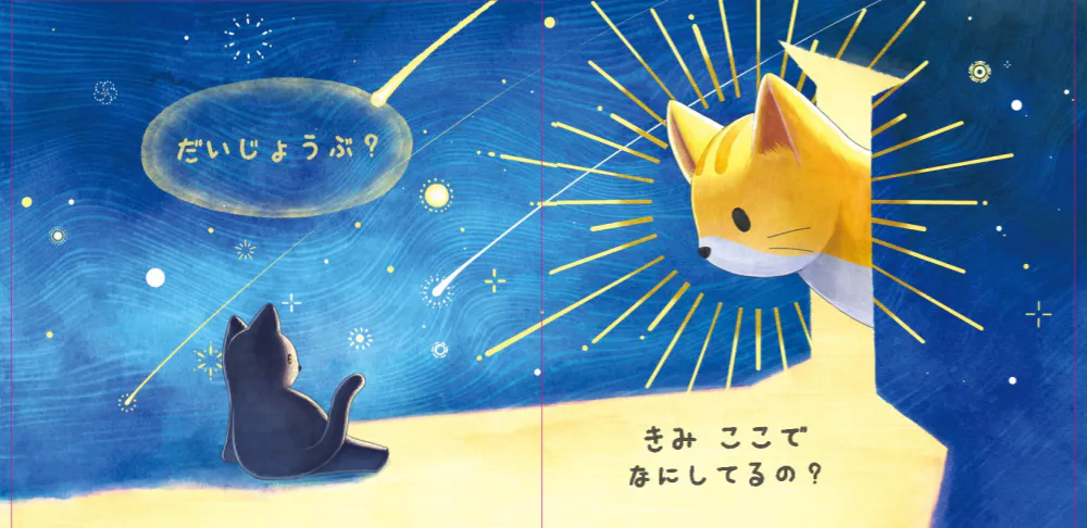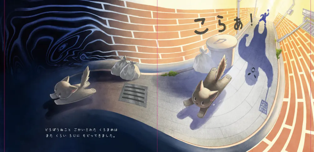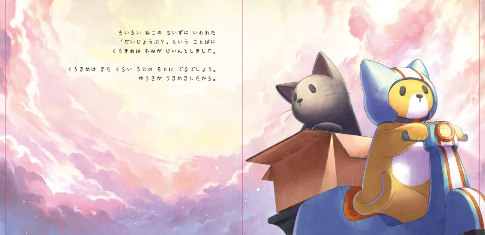 絵本「大丈夫」は、暗闇の中でひとりぼっちだった黒猫の「マメ」が、新しい友達「チーズ」と出会い勇気をもらい暗闇から明るい世界へ飛び出す温かいストーリです。