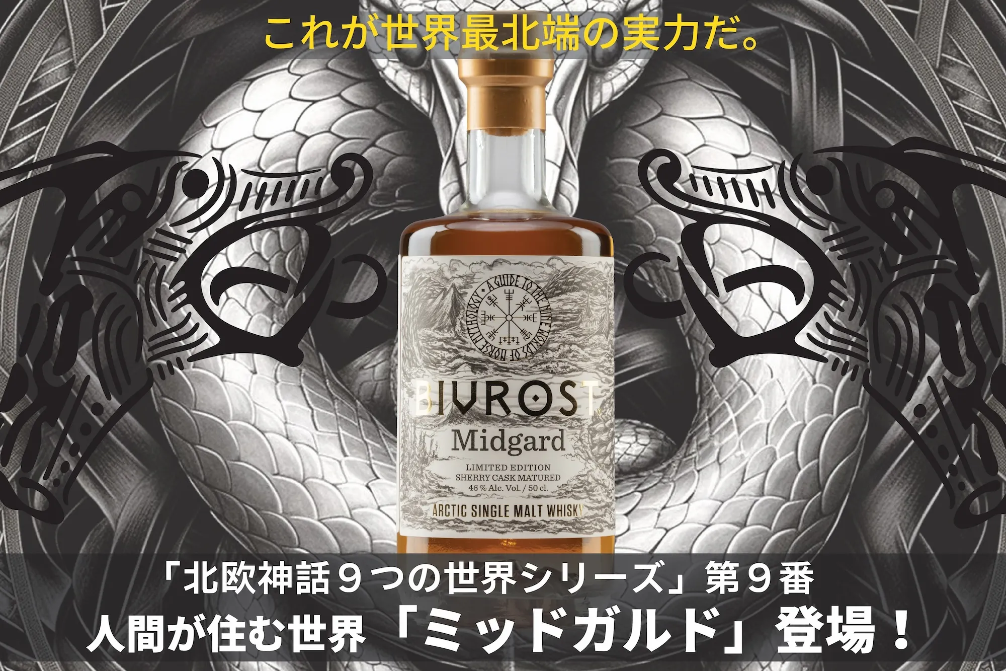 ノルウェー北極圏の世界最北端蒸溜所「オーロラ・スピリット」が氷河の水と北極大麦で作る大人気のリミテッドウイスキーシリーズ「北欧神話9つの世界」の最終章となる「ミッドガルド」ウイスキーの日本先行販売がスタートしています!