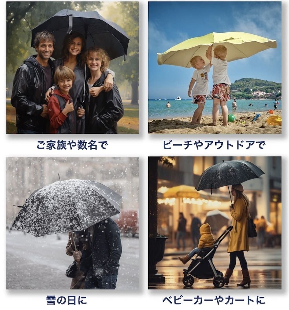 雨の日はもちろん晴れの日もしっかり守ってくれます。ダブルクロス構造&特大サイズで暑い日差しも和らげるからビーチパラソル替わりとしてもオススメです!