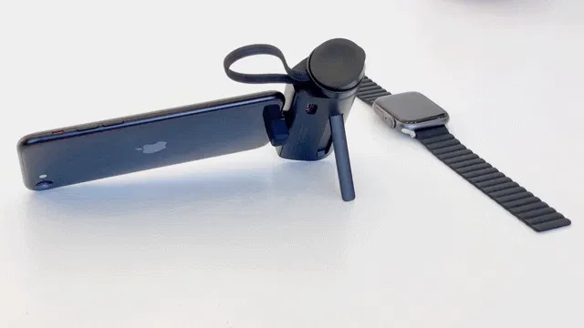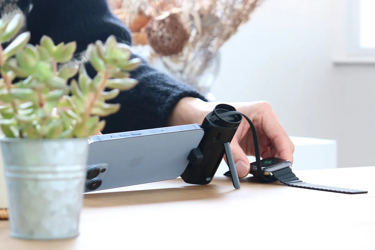 本体の背面にはスタンドが付いているので、動画を見ながらiPhoneとApple Watchの充電ができます。