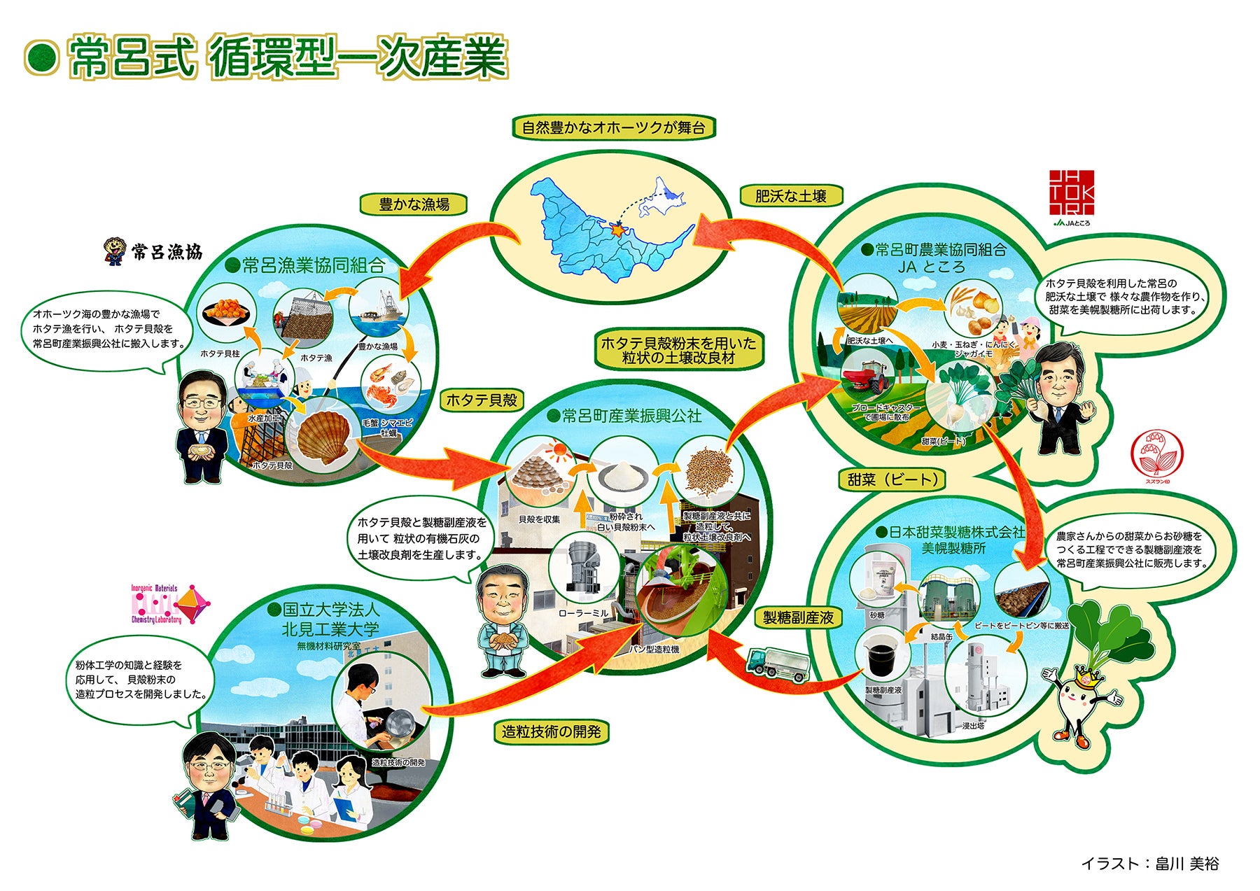 またこの技術開発に当たり、糊としての役割を行う「バインダー」と呼ばれる原料には、常呂で栽培される甜菜(砂糖の原料)から砂糖を作る際に発生する製糖副産液(一般的には廃糖蜜と呼ぶ場合が多いです)を利用する事で、常呂で発生したホタテ貝殻と、常呂で生産した作物の加工で発生する製糖副産液を両方とも使用した新しい土壌改良剤としました。そのため、北見市常呂町では下のイラストで示すような循環型農業が完成し、これを「常呂式循環型一次産業」として掲げています。