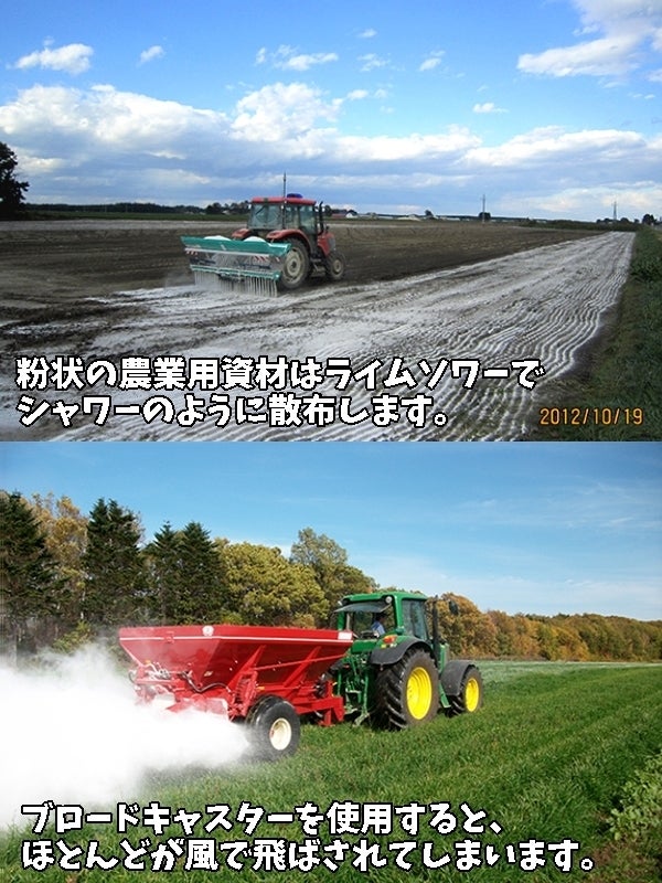しかし時代は進み、農業の大規模化に伴い様々な機械が利用されるようになると、このホタテ貝殻粉末の散布に関連する課題が顕在化してきました。一般的に粉末状の農業用資材はライムソワーと呼ばれるシャワーのような機械を利用して散布するのですが、この場合は約3m程度の幅で散布する事になります。しかし大規模農家が多い北海道では、近年ブロードキャスターと呼ばれる羽を利用して散布する装置が普及しており、この場合は約30m幅で農業用資材を散布することができます。そしてブロードキャスターで粉末状の物を散布した場合、その多くは風によって飛散してしまうため、ブロードキャスターを利用するためには粉末状の物を直径数mm程度の粒状に加工する必要が出てきました。