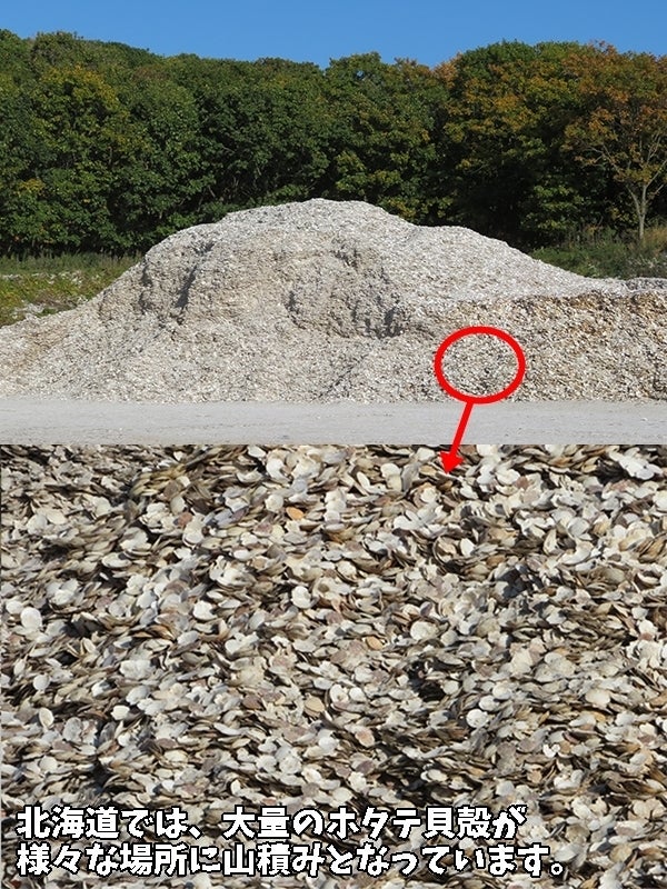 皆さんがオホーツク海沿岸部分を車で移動する事があれば目にする事になると思いますが、様々な場所に上の写真のような貝殻の山が存在しており、これらの有効活用がいかに大きな課題となっているかを実感することが出来ます。そのため現在大学などを中心に、このホタテ貝殻の再資源化に関する研究が様々な分野で進められています。