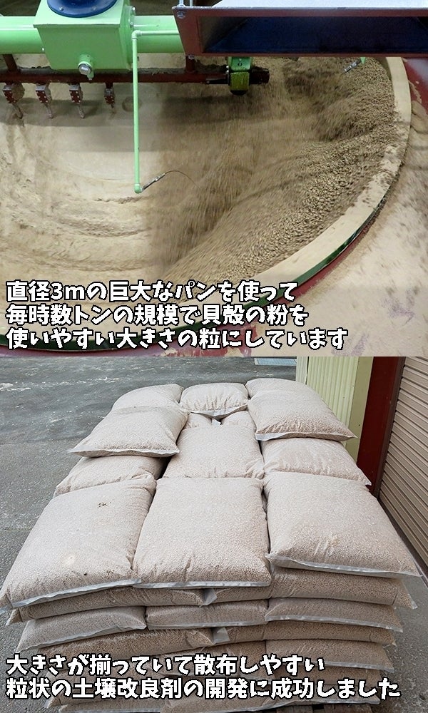 そこで北見工業大学では、専門分野である「粉体工学」と呼ばれる粉を取り扱う学問領域の知識を利用する事で、原料粉末自体に工夫をする事で造粒が可能となる技術開発を行い、これに成功しました。現在この技術を用いて常呂町産業振興公社で新工場が建設され、ここで量産が進められており、近隣農家を中心にホタテ貝殻粉末から作った粒状の土壌改良剤の利用が始まっています。