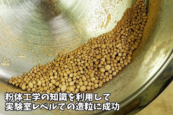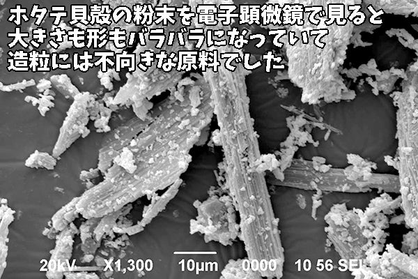 工学の分野ではこのような操作を「造粒」と呼ぶそうですが、この造粒が非常に難しかったのがホタテ貝殻粉末だったようです。北見工業大学に協力の依頼が来るまで農協を中心に様々な検討がされていましたが、なかなか均一な大きさに造粒する事が出来なかったそうです。実際に北見工業大学で最初に試した造粒操作でも、均一な造粒は出来なかったと聞きました。
