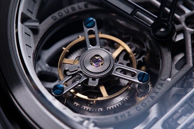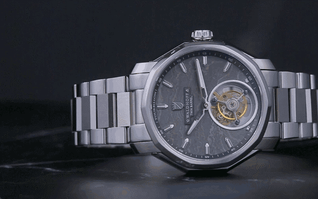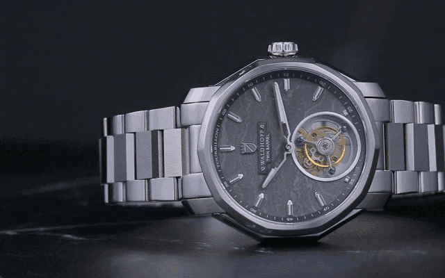 さらに9時方向に配置したトゥールビヨンと2台の香箱に収められたゼンマイ仕掛けが個性を主張し、お洒落度も格段にアップしています。