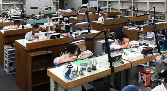 工程別に分けられ、ラインに組み込まれる修理方法ではなく、一本一本の時計を各ウォッチメーカー(=修理技術者)が状態チェックから分解・洗浄・組立・注油・調整・最終チェックまで責任をもって行います。