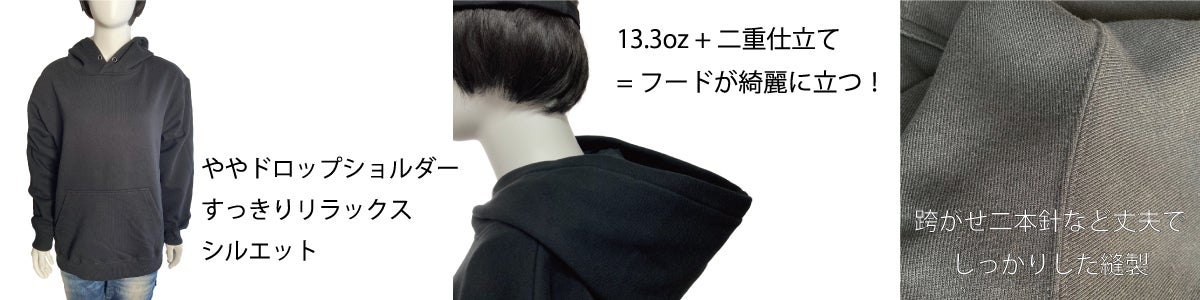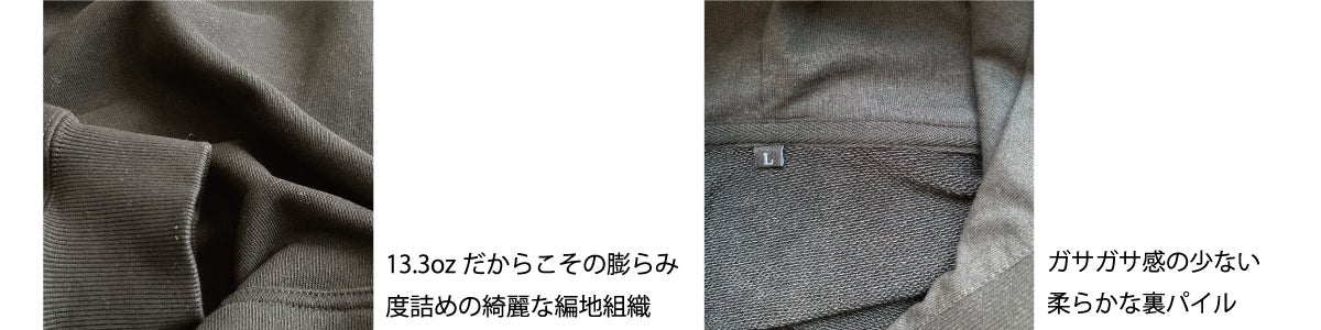 素材ポイント:綿高混率の裏毛素材, 度詰めのしっかりしたヘビーウェイト素材, 綺麗な表面感, 肌触りの良い裏パイル